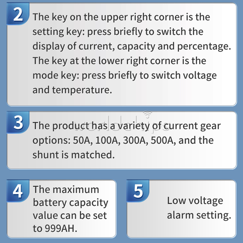 3. Low voltage alarm setting: Enter the setting page to display 00.0V flashing Long press the lower right key to switch the bit number, short press the lower right key to change the parameters, short press the upper right key to confirm and save Long press the upper right key for 3 seconds to return to the main page, the setting is complete.