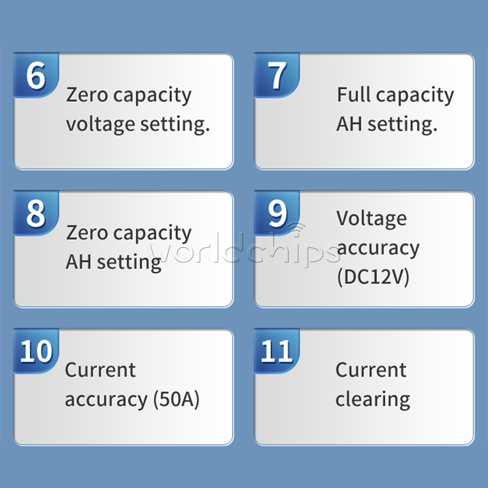 4. Zero capacity voltage setting: enter the setting page to display 0AH 00.V flashing long press the lower right key to switch the bit number short press the lower right key to change the parameters, short press the upper right key to confirm save long press the upper right key for 3 seconds to return to the main page, the setting is complete.