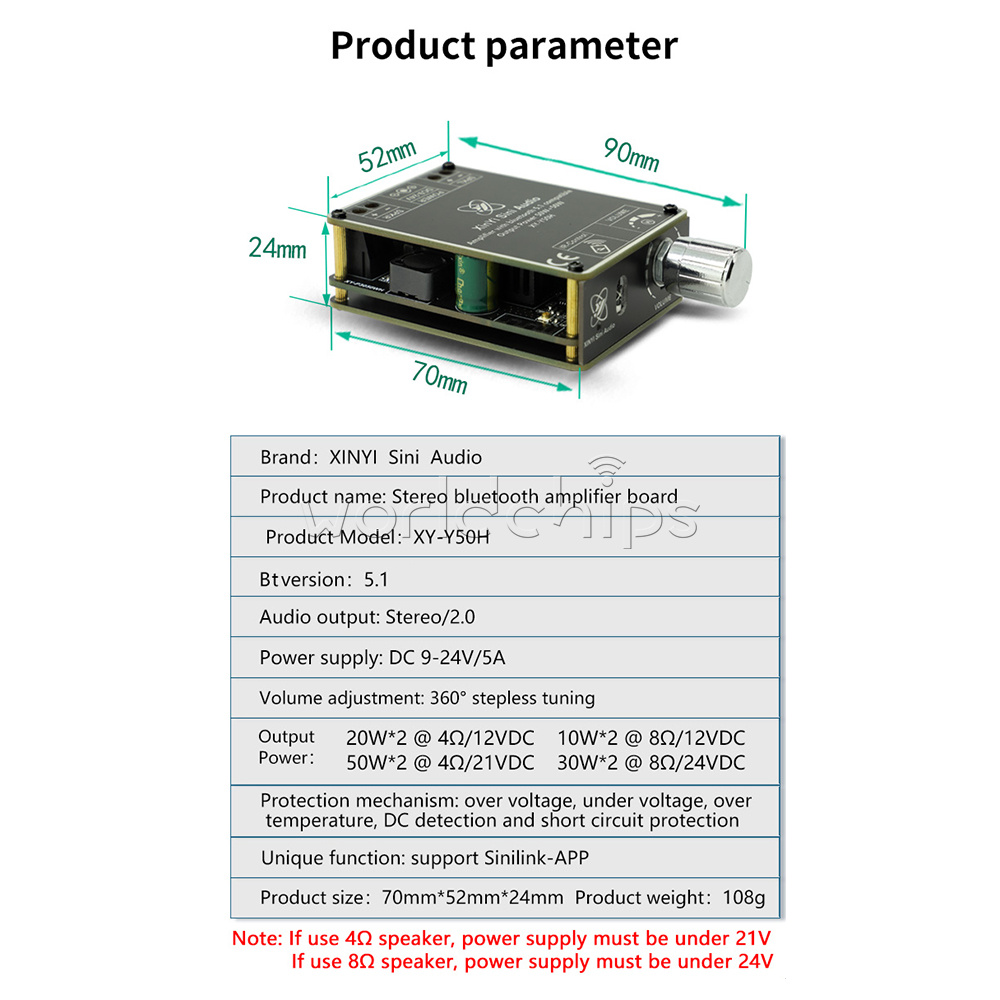 Adaptable speaker impedance 8 ohms, power supply can not exceed 24V