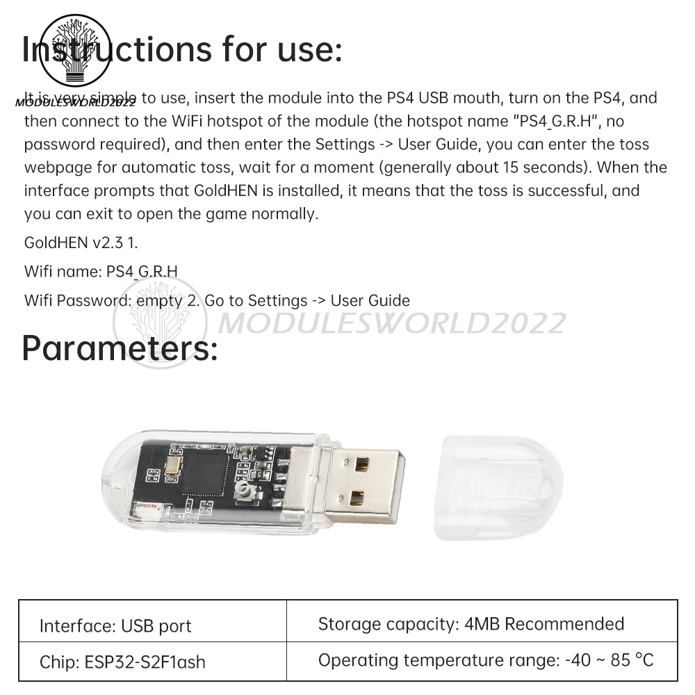 It is very simple to use, insert the module into the PS4 USB port, the PS4 is powered on, and then connect to the module's WiFi hotspot (hotspot name “PS4_G.R.H”, no password required), and then go to Settings->User's Guide, you can go to the Toss web page for fully automated tossing, wait for a few moments (usually 15 Wait for a while (usually about 15 seconds), when the interface prompts the installation of GoldHEN, that is to say, the tossing is successful, you can exit to open the game normally.