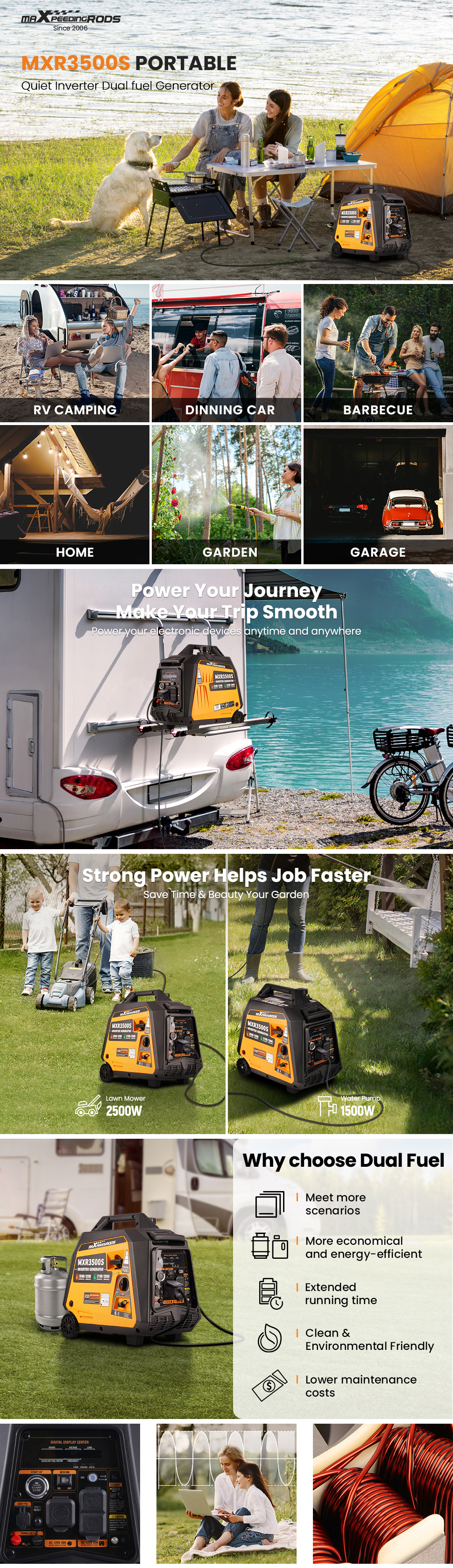 *Dual fuel:Using gasoline, produces 3500W starting watts & 3200 running watts. Using LPG,produces 3100W starting watts & 2800 running watts. It can power air conditioners and many other small appliances such as refrigerators,coffee machine.