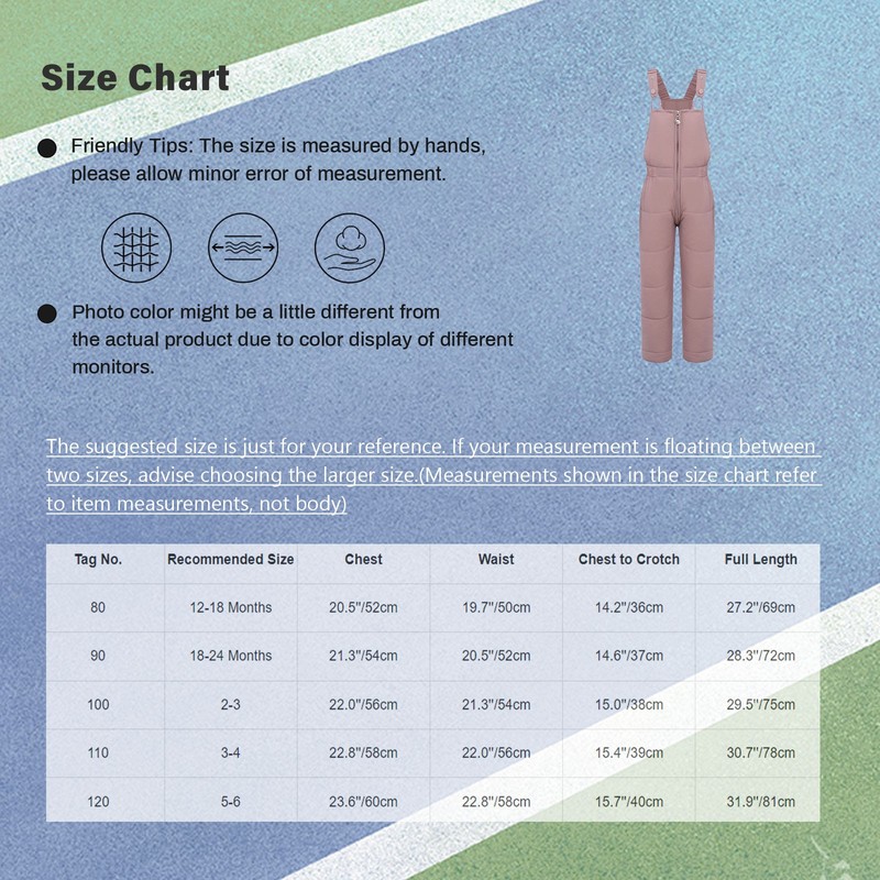 Set Include: 1Pc Ski JumpsuitCondition: New with tagsMaterial: 100% PolyesterFeatures:Made from 100% polyester, this jumpsuit is durable and suitable for various outdoor activities, ensuring long-lasting use.The zipper crotch design makes it convenient for kids to use the toilet, adding practicality to the overall functionality.Elastic shoulder straps provide a comfortable and adjustable fit, allowing kids to move freely without feeling restricted.Padded overalls offer excellent warmth, making it a great choice for the autumn and winter seasons, keeping kids cozy.Suitable for indoor or outdoor activities, travel, shopping, parties, taking commemorative photos and videos, and daily life.