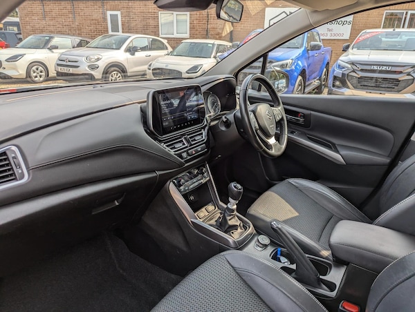 The Suzuki S-Cross 1. 4 Boosterjet MHEV Ultra SUV perfectly blends performance with economy, thanks to its petrol hybrid engine featuring Suzuki's renowned AllGrip four-mode driving system. This vehicle offers a smooth and engaging driving experience with its manual transmission, providing drivers with a sense of connection to the road. Its Euro 6 emissions compliance ensures a reduced environmental impact, making it a wise choice for the eco-conscious driver. With advanced safety technology such as dual sensor brake support and adaptive cruise control, the S-Cross caters to both daily commutes and longer journeys with ease. Finished in sleek black, the S-Cross boasts an eye-catching exterior design with body-coloured door handles and mirrors, coupled with silver under body trim for added sophistication. The 17-inch polished alloy wheels enhance its stylish appeal, while the chrome window sills and grille add a touch of elegance. Inside, comfort is prioritised with heated front seats, a leather-covered steering wheel, and dual-zone automatic air conditioning, ensuring a pleasant environment for all occupants. The double sliding panoramic sunroof further enhances the driving experience, allowing natural light to flood the cabin. The S-Cross is equipped with a wealth of features to elevate convenience and connectivity. The 9-inch infotainment display, integrated with Bluetooth, Apple CarPlay, and Android Auto, keeps you connected, while the navigation system ensures you stay on the right path. Safety is paramount with features like blind spot monitoring, lane departure warning, and rear cross-traffic alert. The 360-degree camera and front and rear parking sensors facilitate easy manoeuvring, while the keyless entry and start system add a layer of convenience. With ample storage options including a centre console box and a luggage area shopping bag hook, the S-Cross is designed to meet your daily needs with practicality and style.