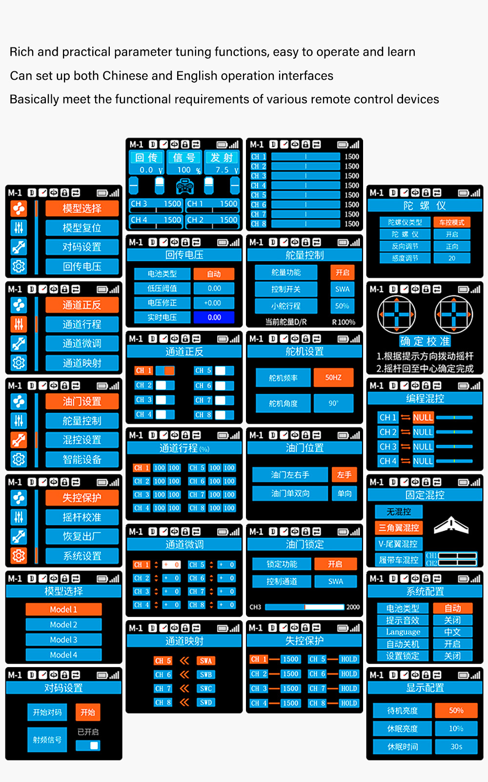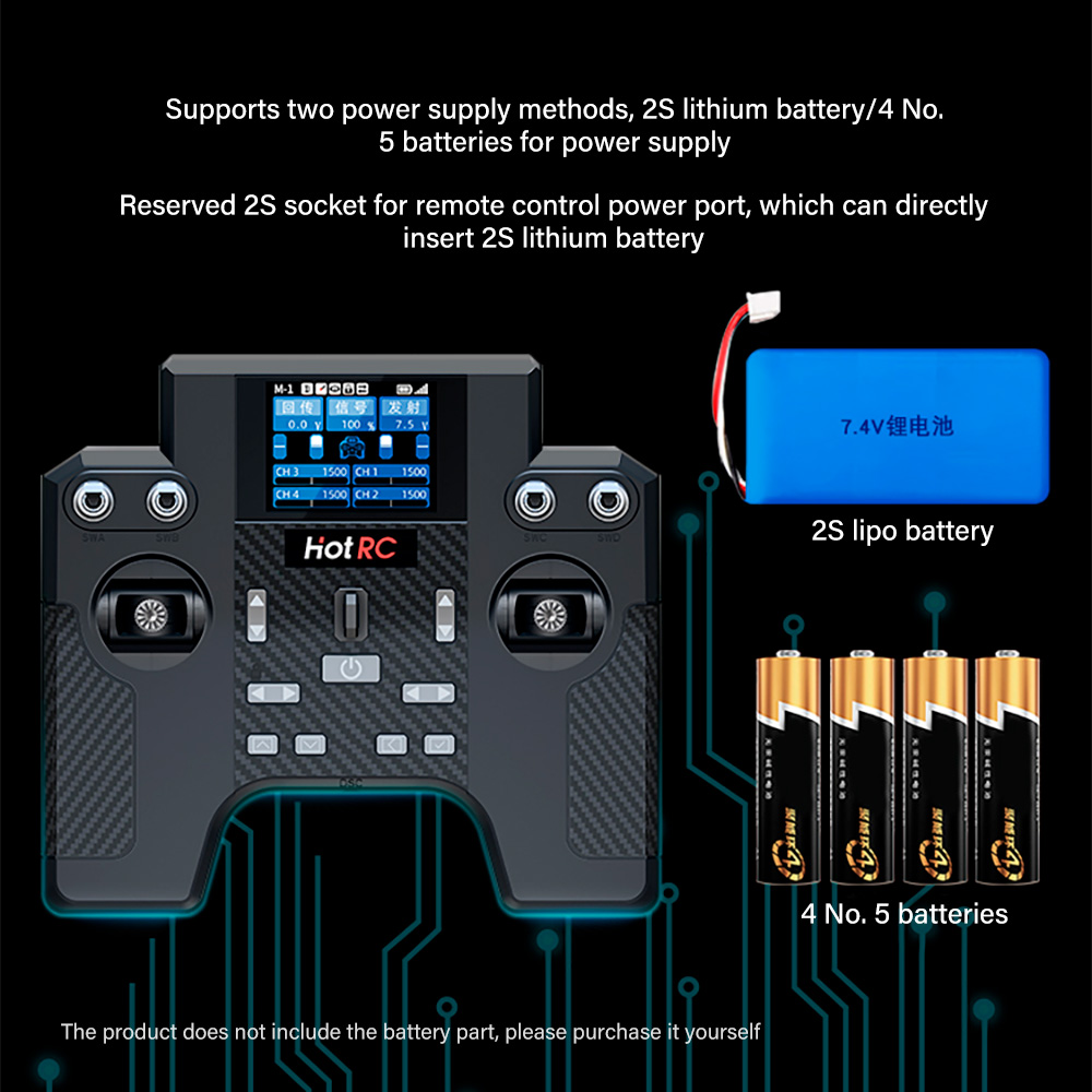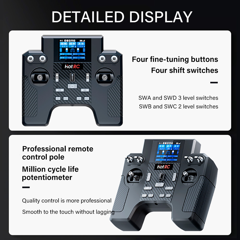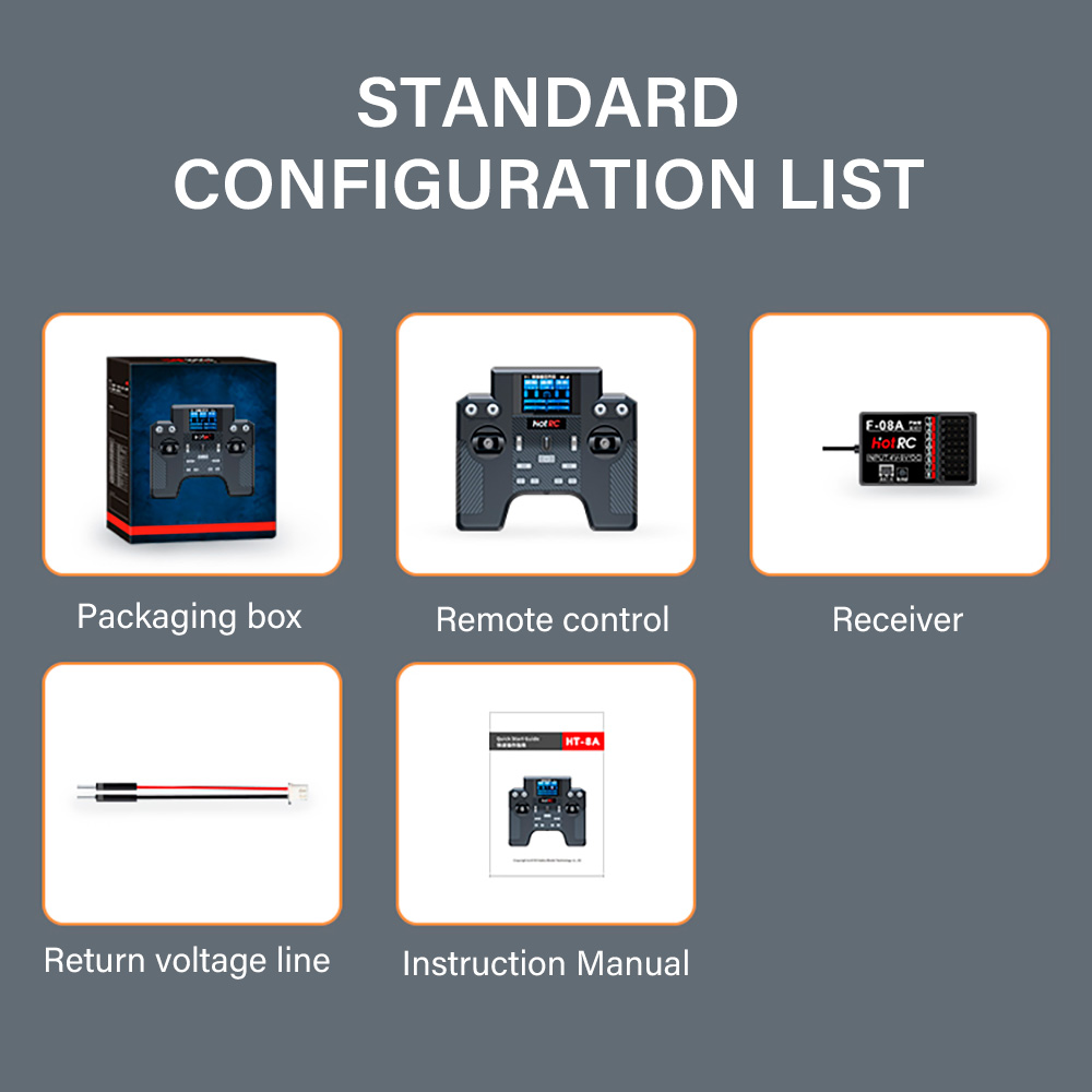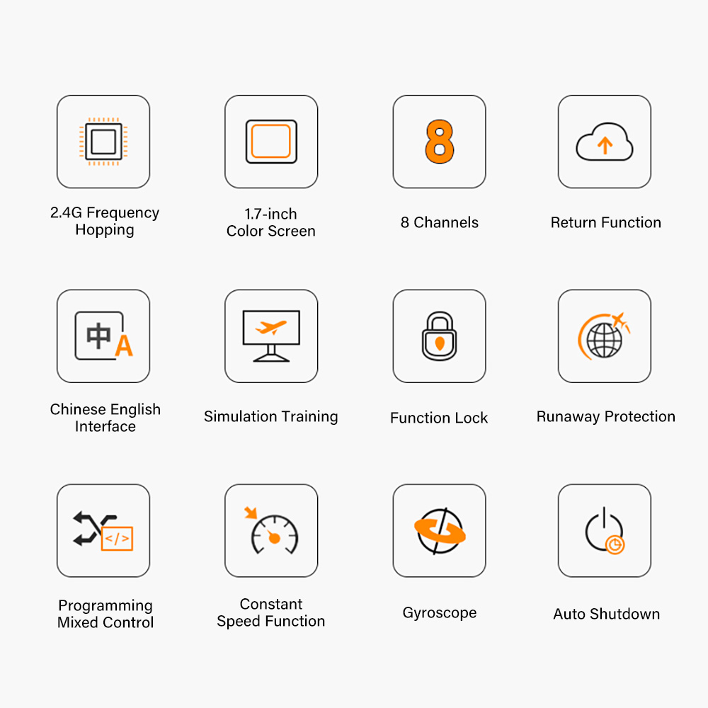 HT-8A1.7inch color screen,8 channels remote control Receiver,comes standard with return function and supports 2 power supply modes, 5 batteries and 2S lithium batteries,Equipped with English and Chinese interfaces, runaway protection function, online upgrade function, speed cruise control various functions.