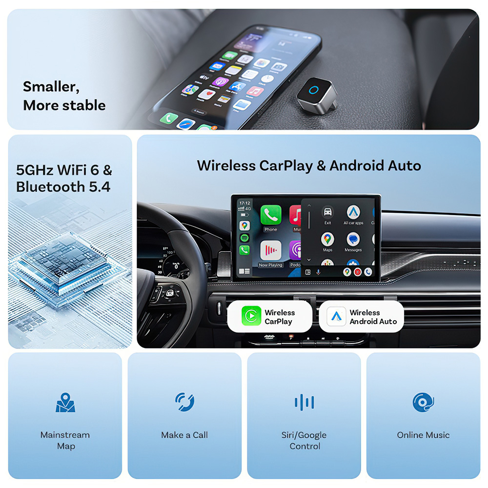 Experience Seamless Wireless Driving with the Mini Cube 3.0. This Compact Wireless Carplay and Android Auto Adapter Offers Instant Plug & Play Setup, Fast Auto Reconnection, And Stable Performance for a Smarter, Cable-Free Journey.