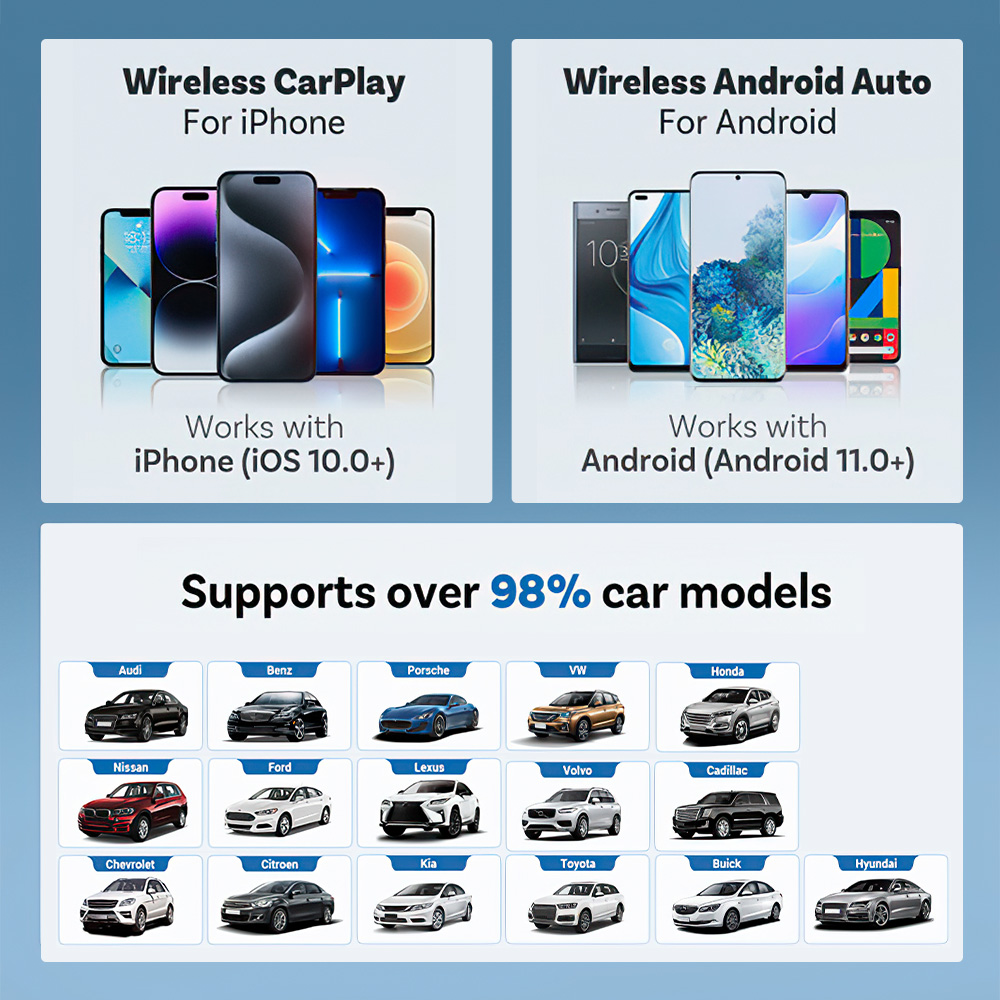 Wireless Freedom: Enjoy CarPlay and Android Auto without messy cables.
