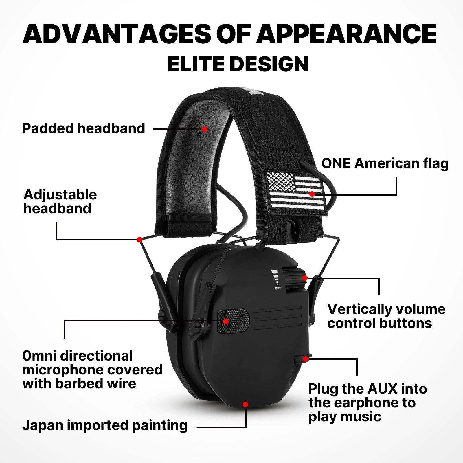 Niedriges Profil der Ohrmuscheln für die Freigabe des Waffenschafts; verstellbarer