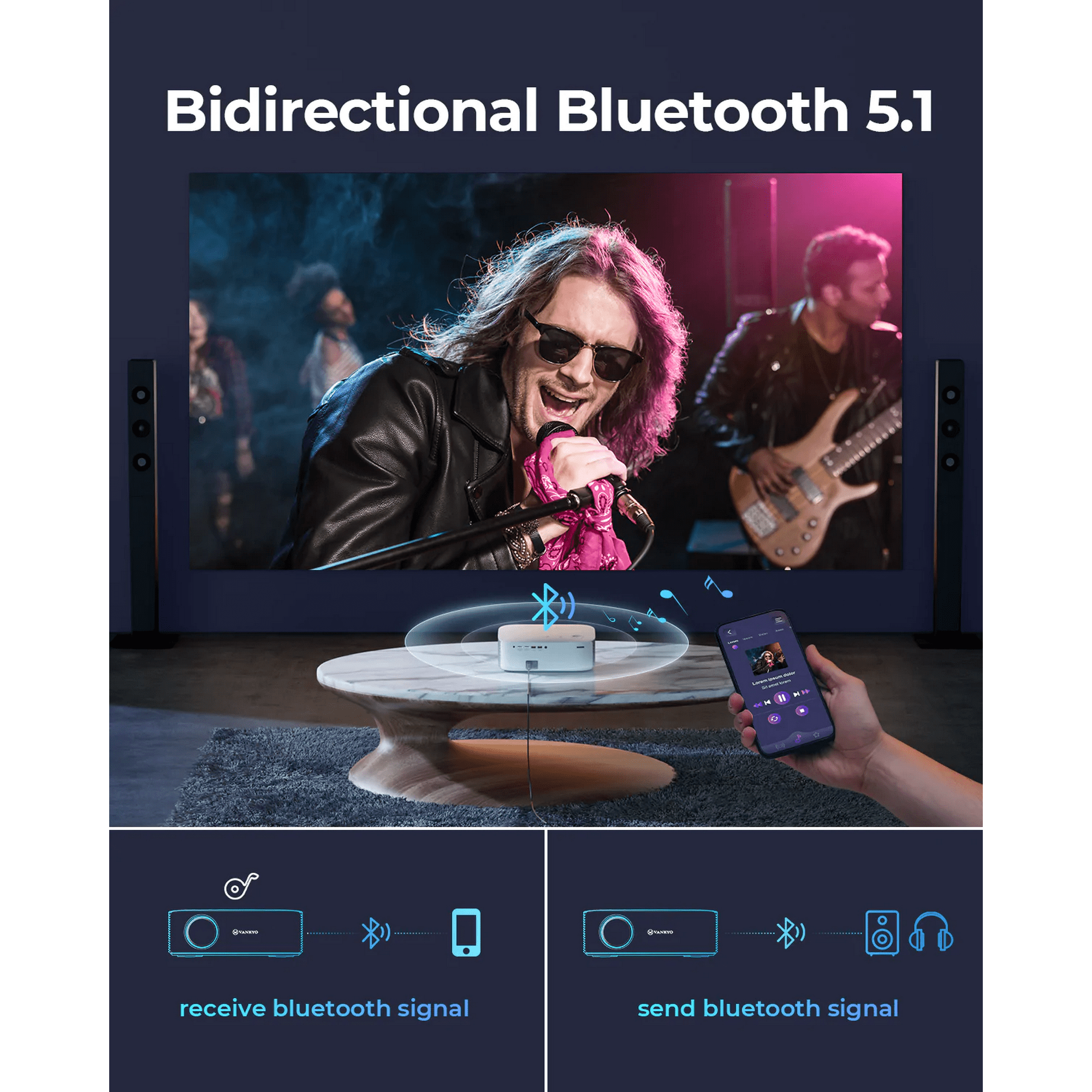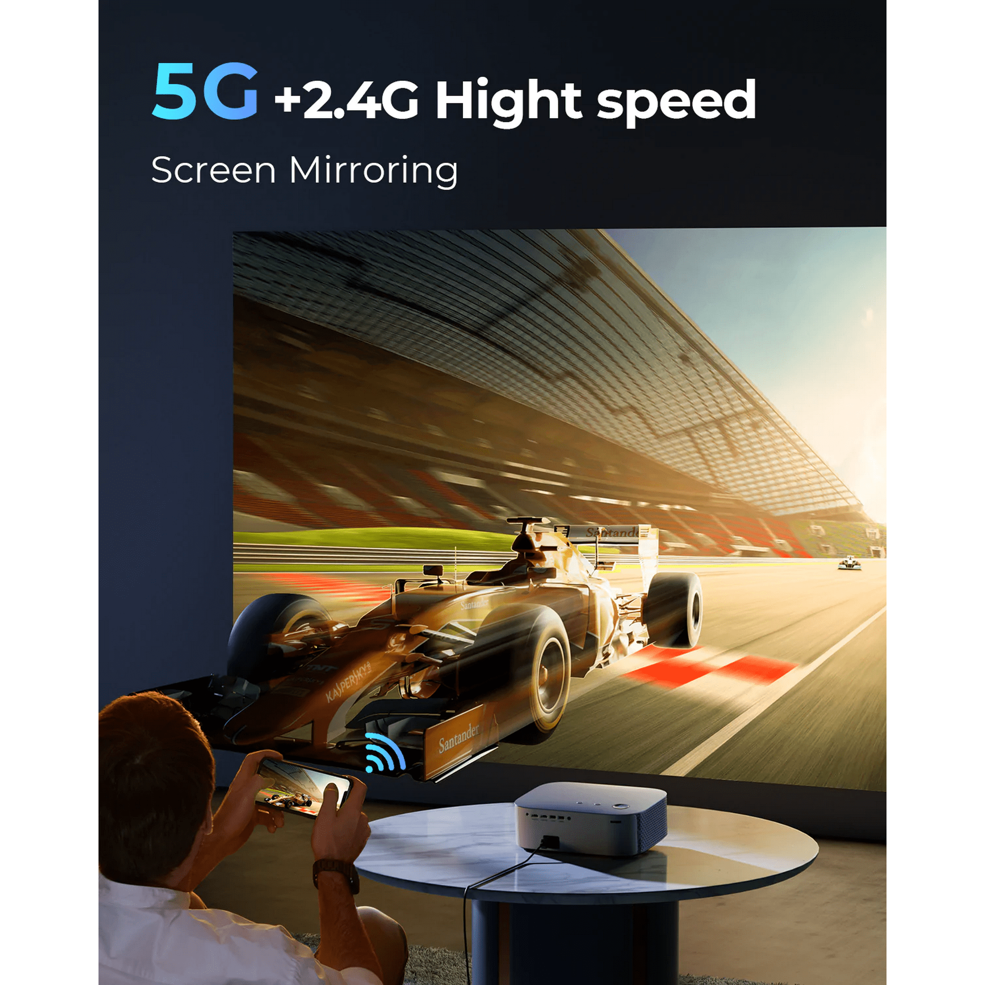 The movie projector can wirelessly mirror videos, photographs, and games from smartphones (iOS/Android) or other devices to the big screen more quickly because of its ultra-fast and stable 5G and 2.4G Dual-Band WiFi. Additionally, it includes a Bluetooth connection, allowing you to pair Bluetooth speakers, headsets, or earphones with it.