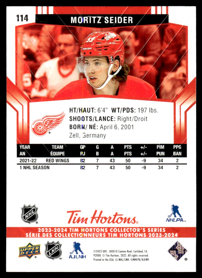 | 2023-24 Upper Deck Tim Hortons Moritz Seider Detroit Red Wings #114 |