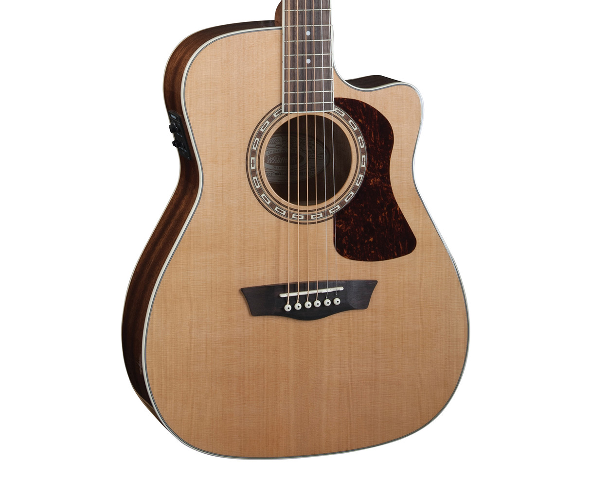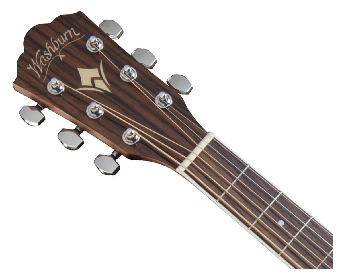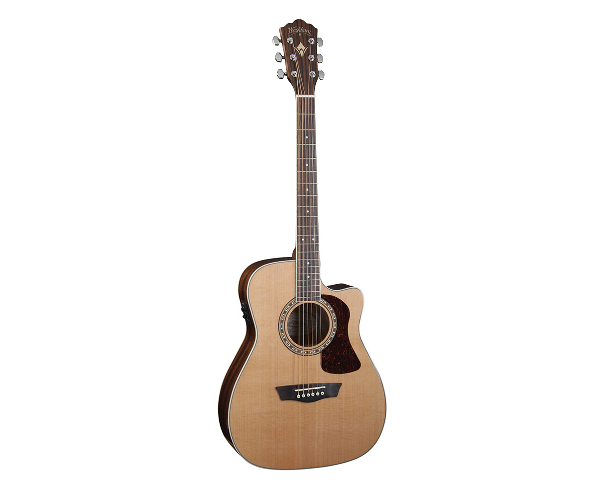 The F11SCE is a folk style acoustic guitar that’s perfect for singer/song writers and those who love the added articulation that a folk sized body brings to the tonal table. The cutaway makes it possible to reach the highest frets and the included Fishman electronics let you sound your best when amplified. It features a solid cedar top and Cathedral Peak Scalloped-X bracing for superior tone that improves with age, mahogany back, sides and neck, an Ovangkol fingerboard and bridge, die-cast tuners for quick, easy and accurate tuning, a Washburn tortoise pick guard and a Washburn Heritage rosette.