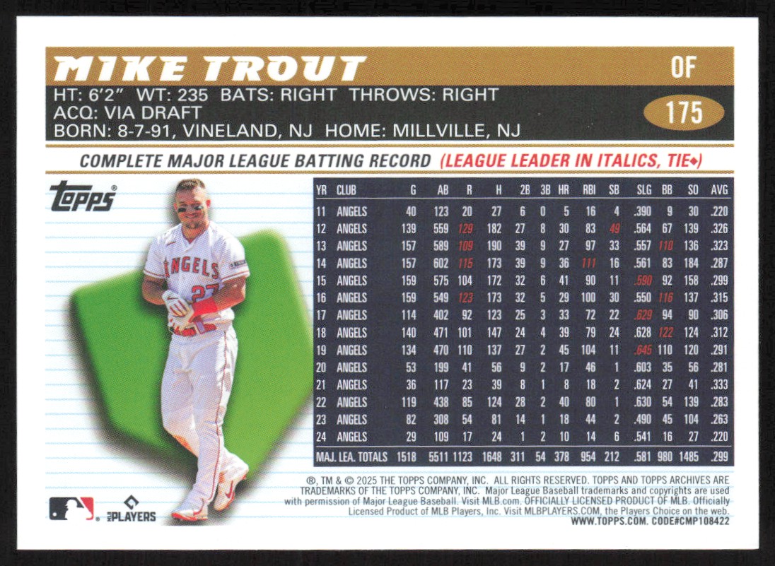 | 2025 Topps Archives Base Mike Trout Los Angeles Angels #175 | ||||||||||||||||||