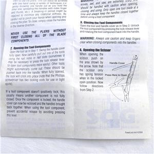 - A variety of tools such as needle-nose pliers, a wire cutter, a blasting cap crimper, a partially serrated knife blade, a double-tooth saw, multiple screwdrivers, a 1/4-inch socket drive, awl, can opener, bottle opener, and scissors.