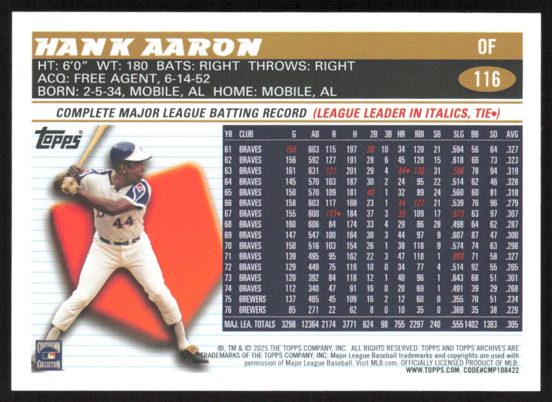 | 2025 Topps Archives Base Hank Aaron Atlanta Braves #116 | ||||||||||||||||||