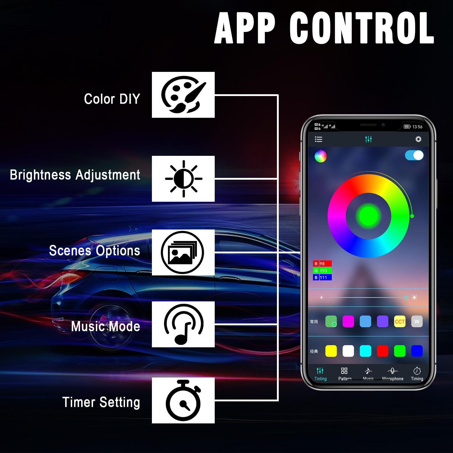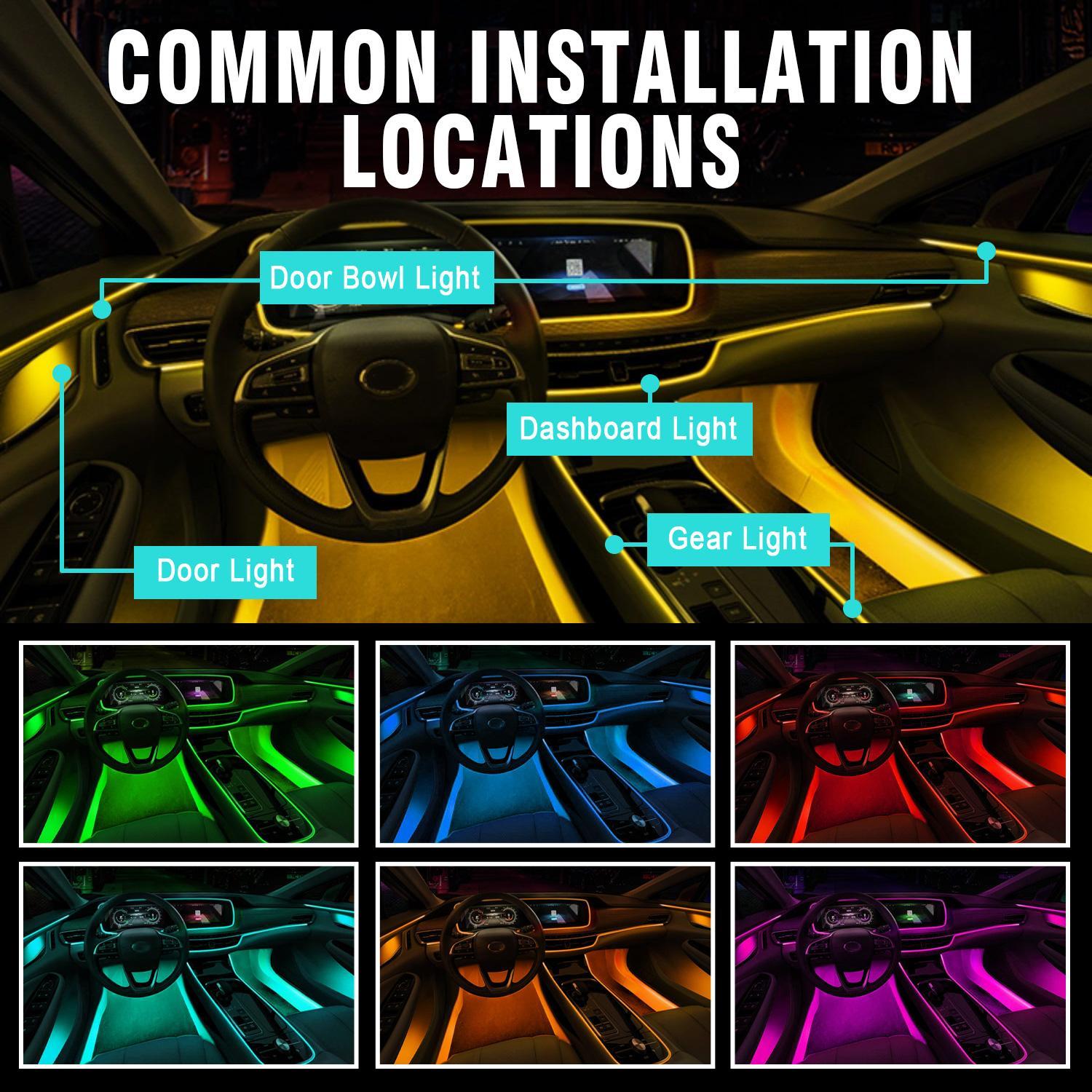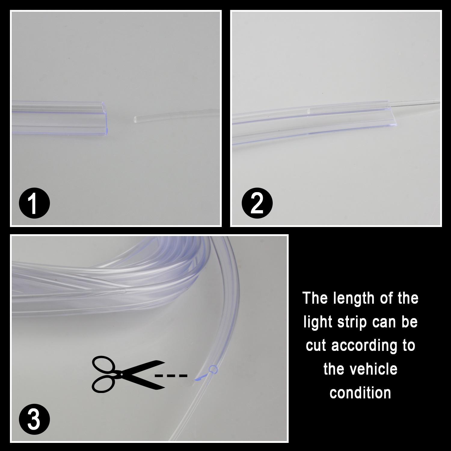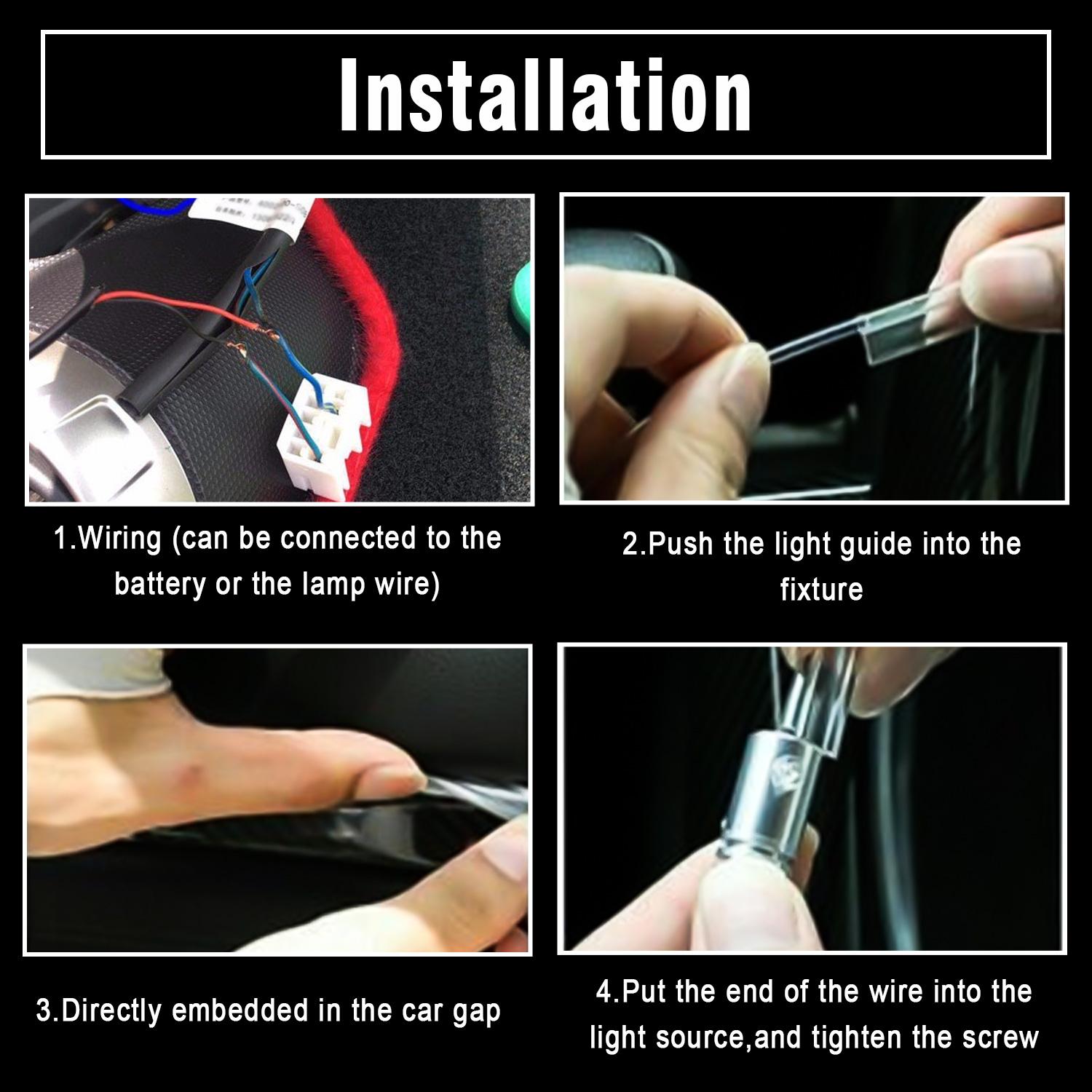 The kit supports DIY installation. Wire to car battery or existing lamp wires. Flexible light guides fit fixtures or car panel gaps. Light strips can be cut for a perfect fit.