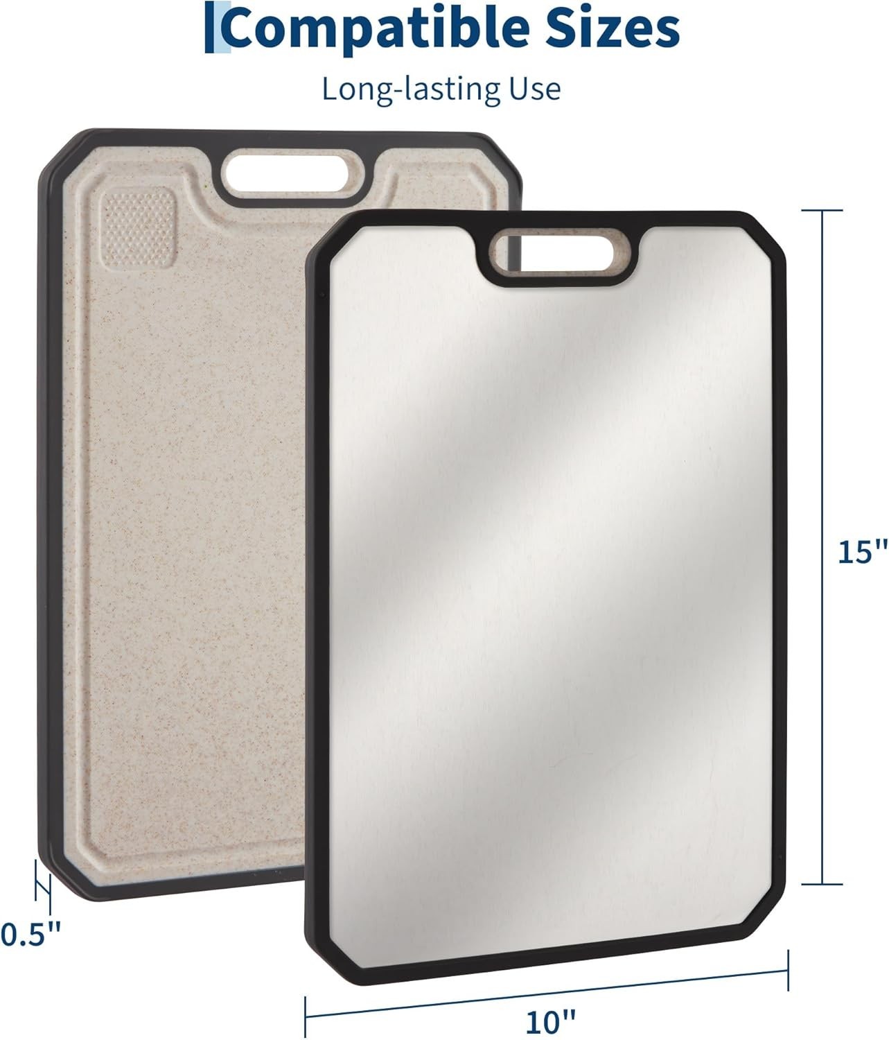 Upgrade your kitchen basic with this select 15x10 inch double-sided titanium-coated markless steel cutting board. Designed for home cooks and professional chefs alike, it delivers unmatched durability, hygiene, and style for all your kitchen prep needs. Experience the balance of functionality, durability, and elegant design with this titanium-coated markless steel cutting board — a must-have addition to any kitchen. Product Description