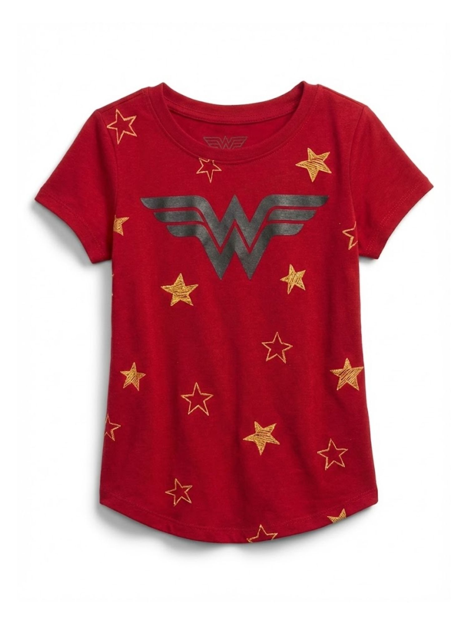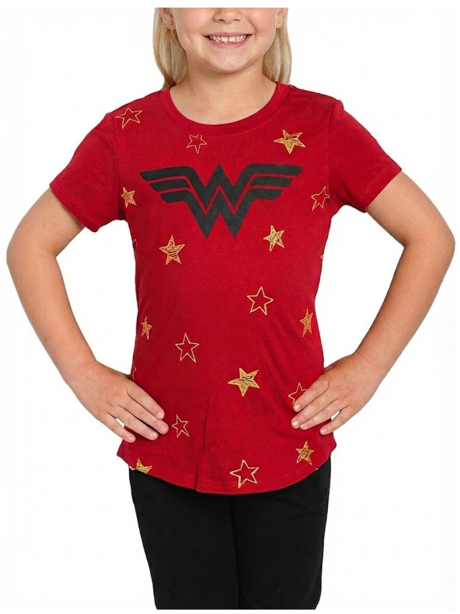 - Design: Girls Wonder Woman Logo Stars Short Sleeve T-Shirt in vibrant Red.