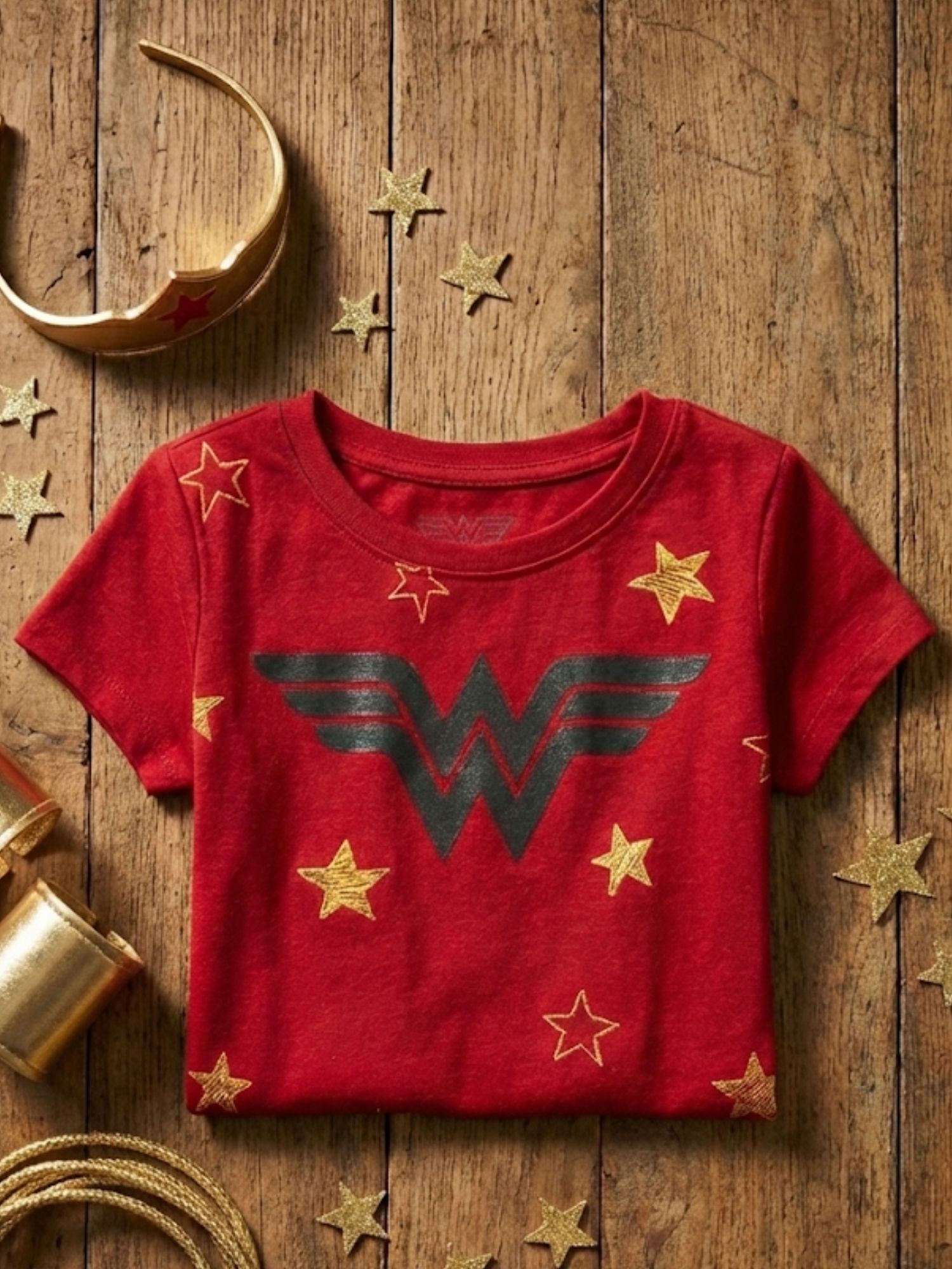 - Graphic Details: Featuring glittery gold stars all-over and the iconic Wonder Woman logo prominently on the front.