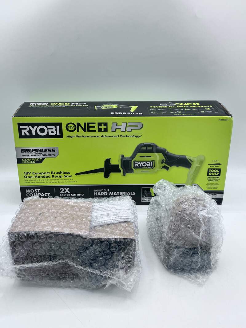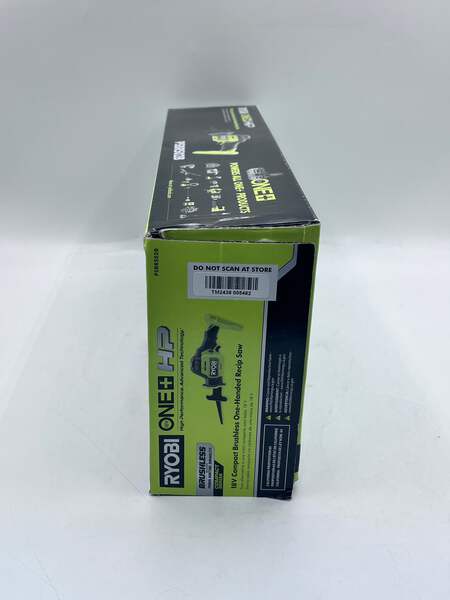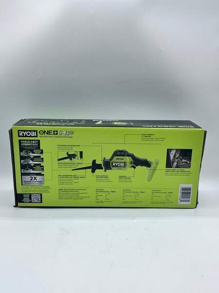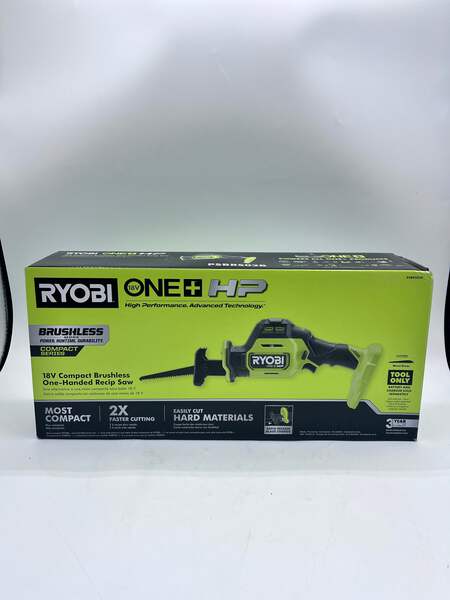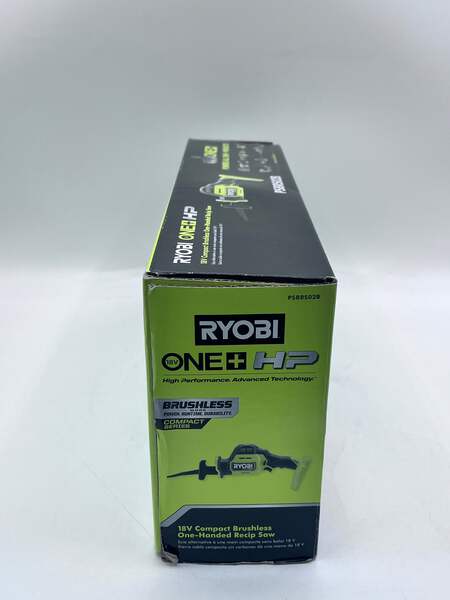 The Ryobi ONE+ HP 18V Compact One-Handed Reciprocating Saw comes in a vibrant green finish, showcasing its modern design. The tool is presented in its original packaging, ensuring it remains in pristine condition.