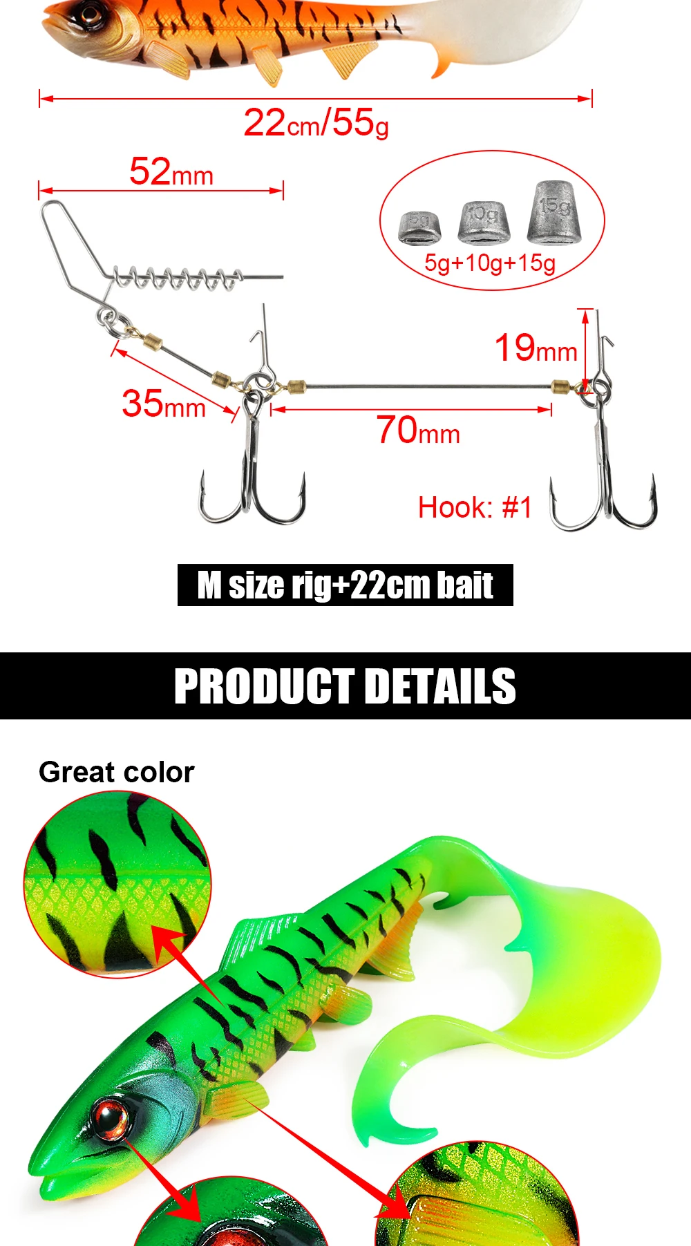 The Firebomb swimbait Kit is available in 2 catchy sizes:17.5cm – 30 gr With S Size Rig Kit22 cm – 55 gr With M size Rig Kit