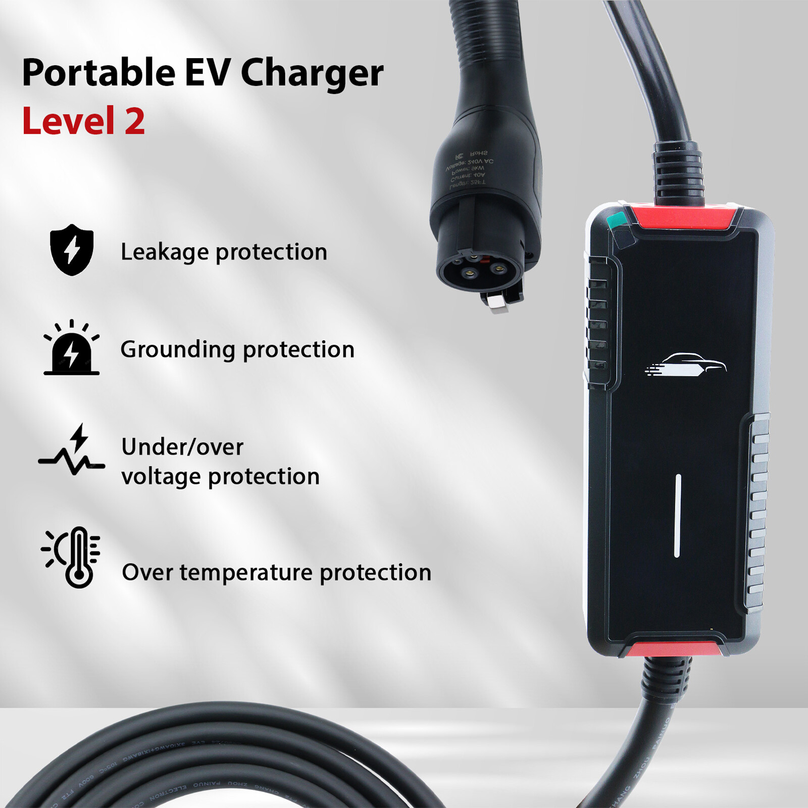 4.Safety is a top priority, which is why this charger is equipped with a LED indicator on the control box. This indicator displays the charging status of your EV, alerting you immediately to any potential issues. Additionally, the charger incorporates triple protection functions, including Leakag Protection, Overcharge Protection, and Under Voltage Protection, ensuring.