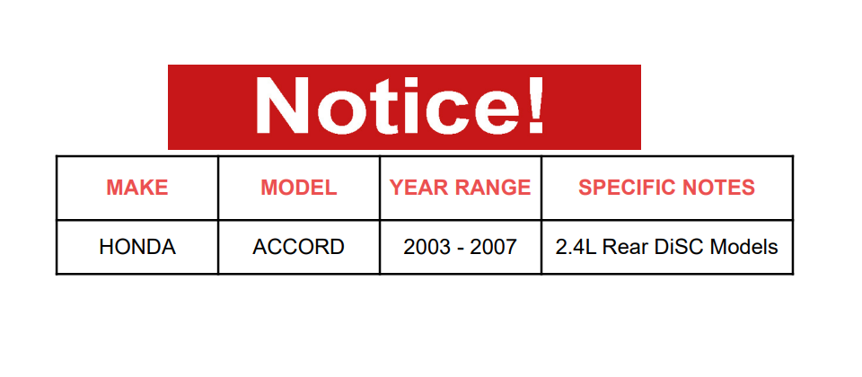 | HONDA | ACCORD | 2003 - 2004 | 2.4L; 4-Wheel Disc Brakes; Vehicles Built for United States Market |