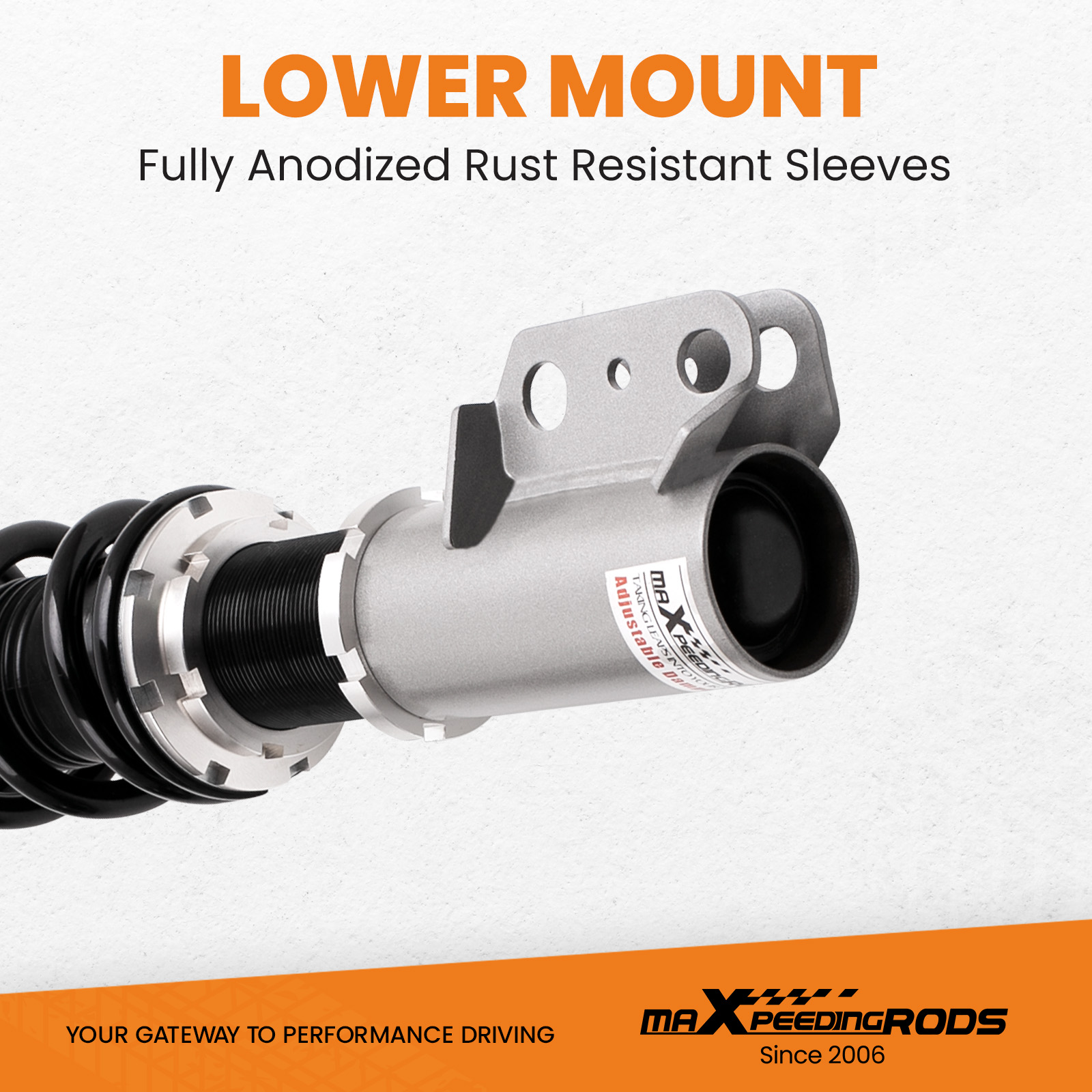 2.24 levels of adjustable damper -- This allows you the ability to perfectly dial in your coil-overs system. For nice comfortable driving, set damping to full soft. For more spirited driving, set it to 16 clicks. For occasional track days, set it to full stiff.
