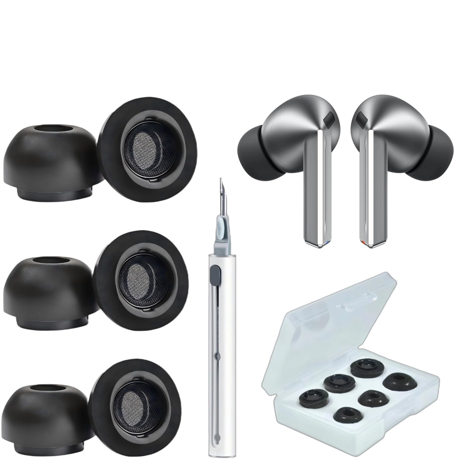 - Custom Sizing & Effortless Convenience:Choose your perfect fit with Small/Medium/Large sizes – included in every set. The tips fit seamlessly into your charging case (no removal needed) and come with a sleek magnetic carrying case for on-the-go protection. 【Package Included】3 Pairs* Memory Foam Ear Tips for Galaxy Buds 3 Pro (S/M/L, 3Sizes) ; 1* Cleaner kit; 1* Portable Storage Box. (Not included earphone)