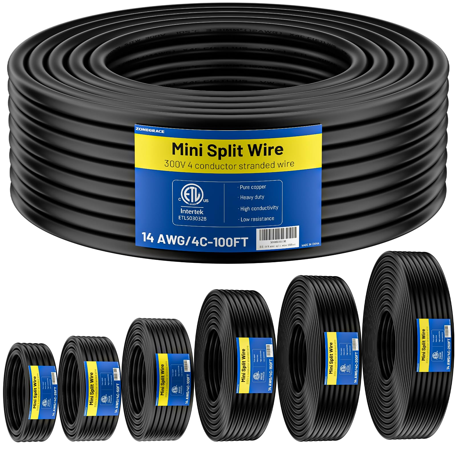 ZONEGRACE 100FT 14/4 Mini Split Cable, 14 AWG 4 Conductor 100ft, Black