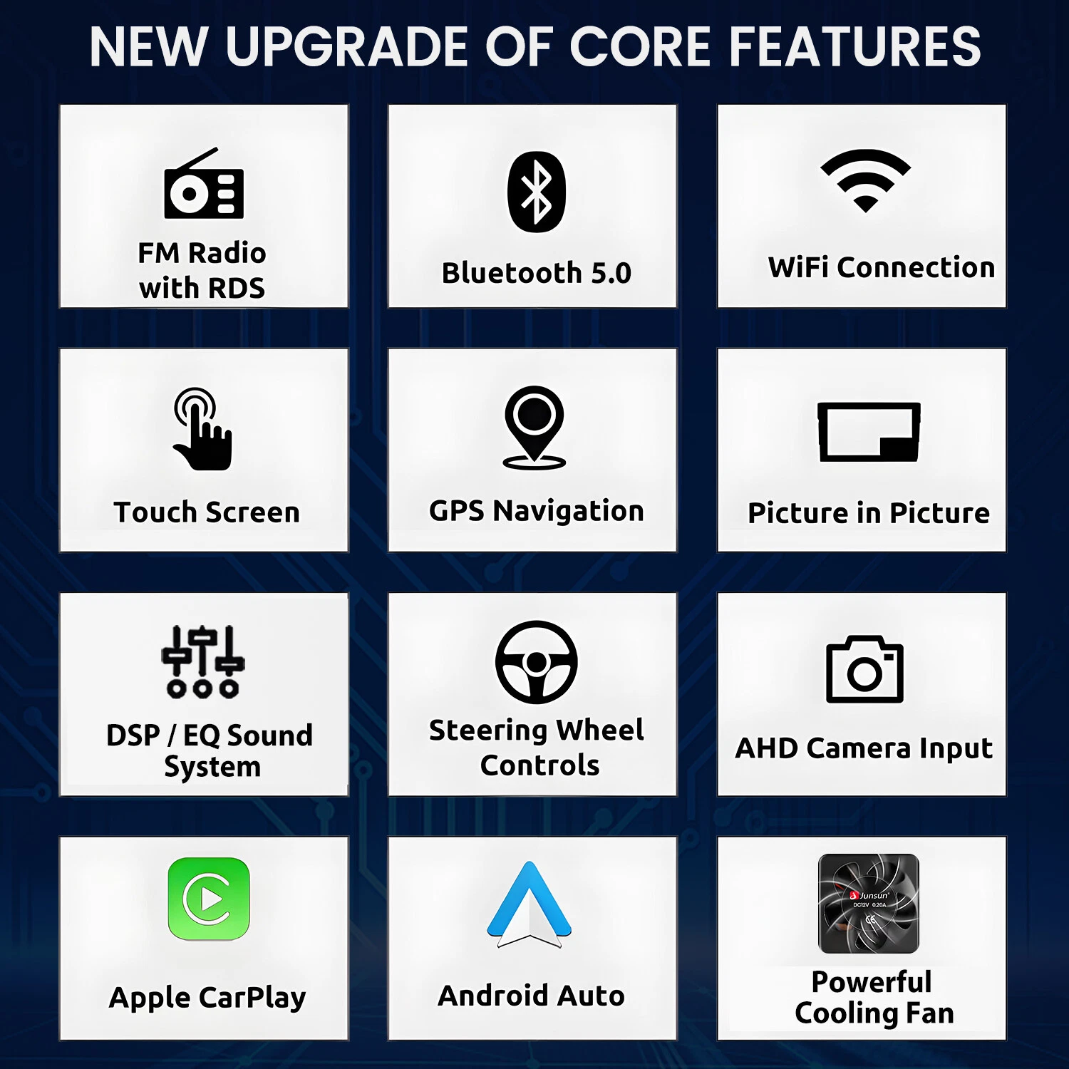 | Features | Bluetooth, DSP, WIFI, DAB+, MirrorLink, RDS, Touchscreen, MP3/MP4 Player, Wireless Apple Carplay, Touch Screen, Steering Wheel Control, Built-in Equaliser, Sat Nav Compatible, Built-in Speakers |