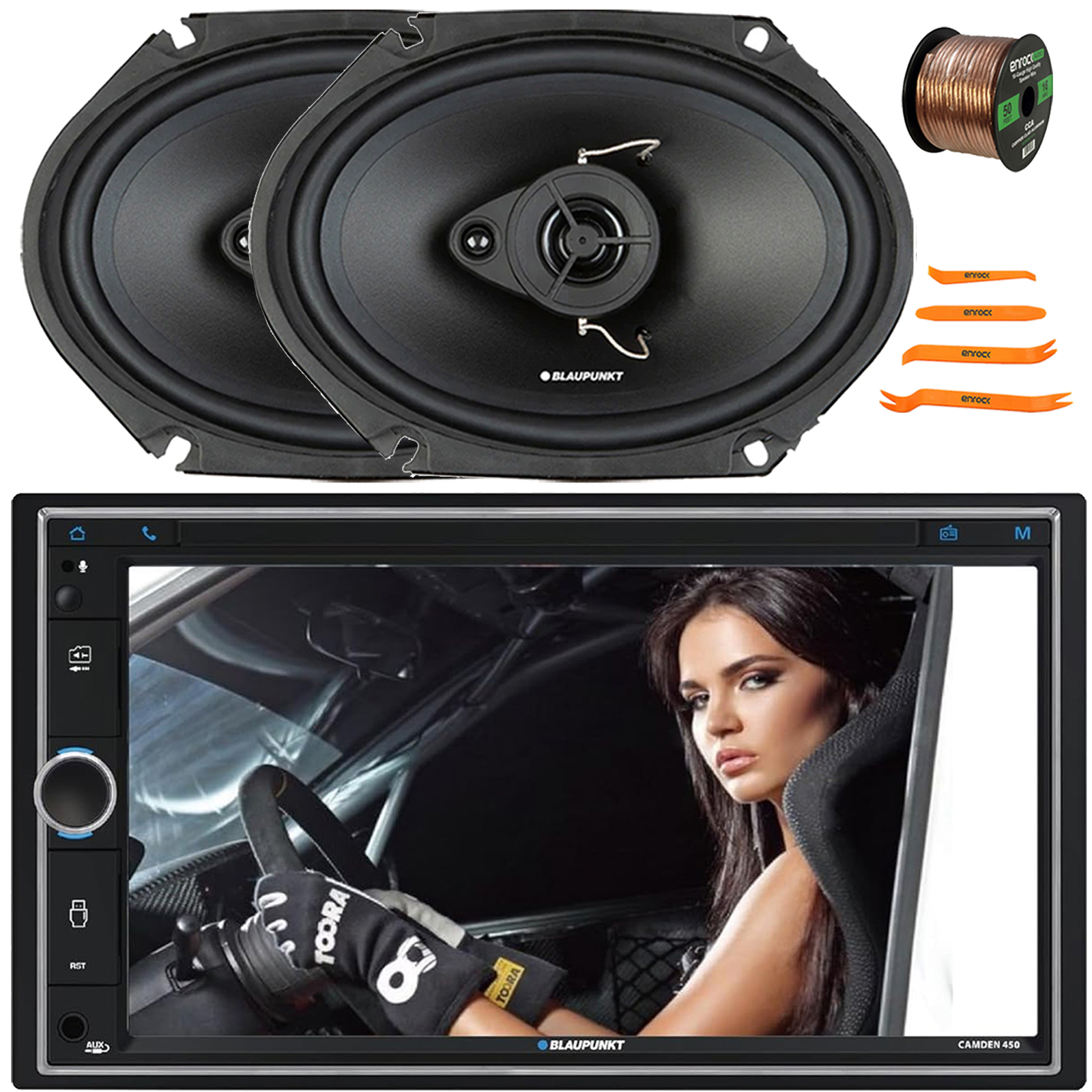 PACKAGE BUNDLE INCLUDES: Blaupunkt CAMDEN 450 7” Touchscreen Double DIN Bluetooth USB/AUX AM/FM Radio Multimedia Digital Media Receiver, 2x Blaupunkt BPS-E683 6x8" 60 Watt Max Power 3-Way Car Audio Speakers (No Grilles), 50 Feet 16 Gauge Speaker Wire, 4-Piece Plastic Car Door Trim, Dash & Stereo Removal Pry Tool Set