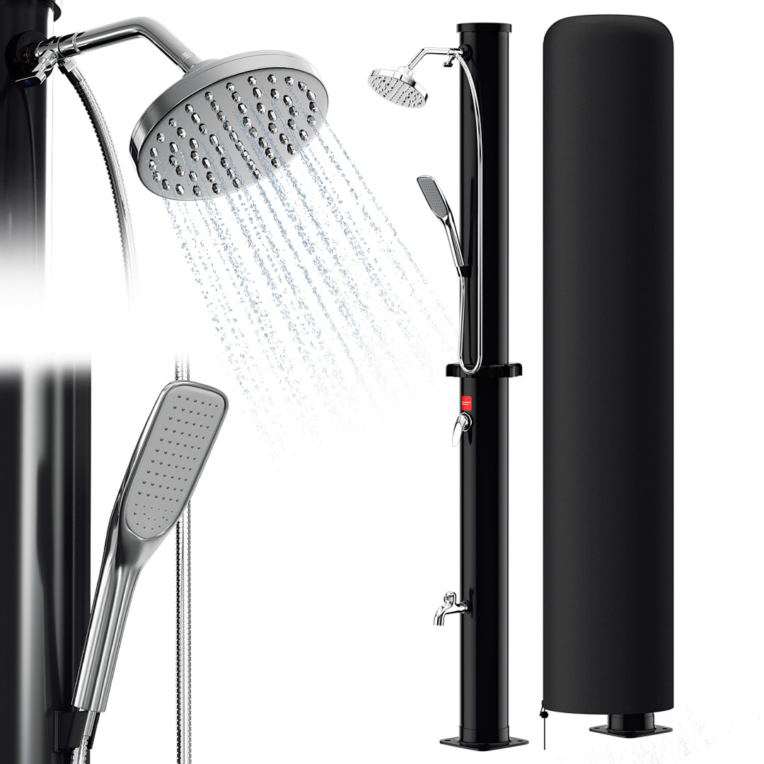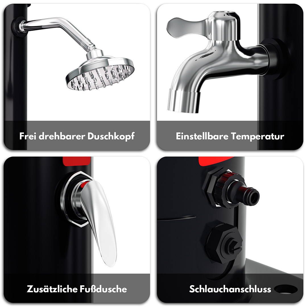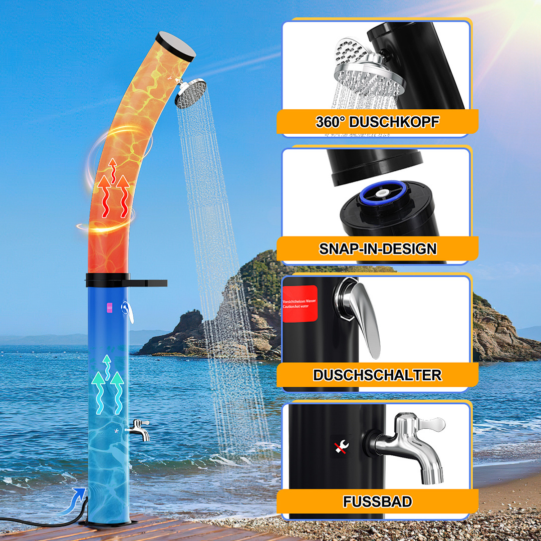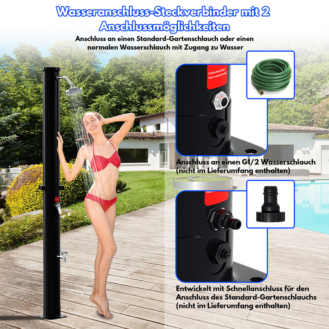 Diese Reihe von Solar-Gartenduschen bietet eine große Auswahl an Fassungsvermögen von 20 Litern bis 60 Litern, um verschiedenen Nutzern gerecht zu werden. Ob für den Einzelgebrauch in einem kleinen Garten oder für einen großen Garten, der von mehreren Personen genutzt wird, diese Duschen liefern reichlich warmes Wasser. Die aus hochwertigem Kunststoff und Chrom gefertigten Brausen bieten ein modernes und langlebiges Design und sind mit einem großen, um 360° verstellbaren Duschkopf ausgestattet, der ein komfortables Duscherlebnis garantiert. Dank des Standard-Gartenschlauchanschlusses und der einfachen Installation ist sie leicht zu bedienen. Die Erwärmung des Wassertanks durch Solarenergie ist sowohl umweltfreundlich als auch energieeffizient und macht sie zur idealen Lösung für das Duschen im Freien.