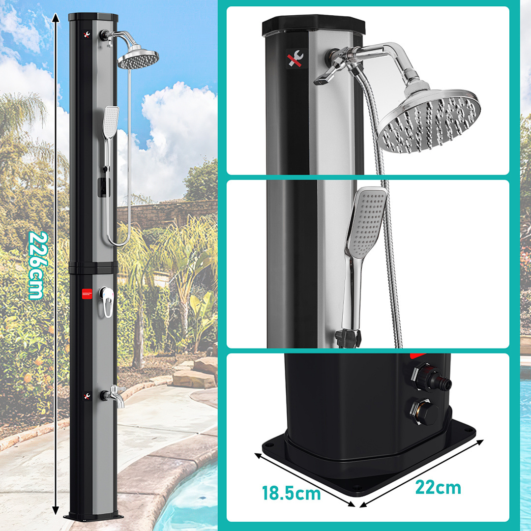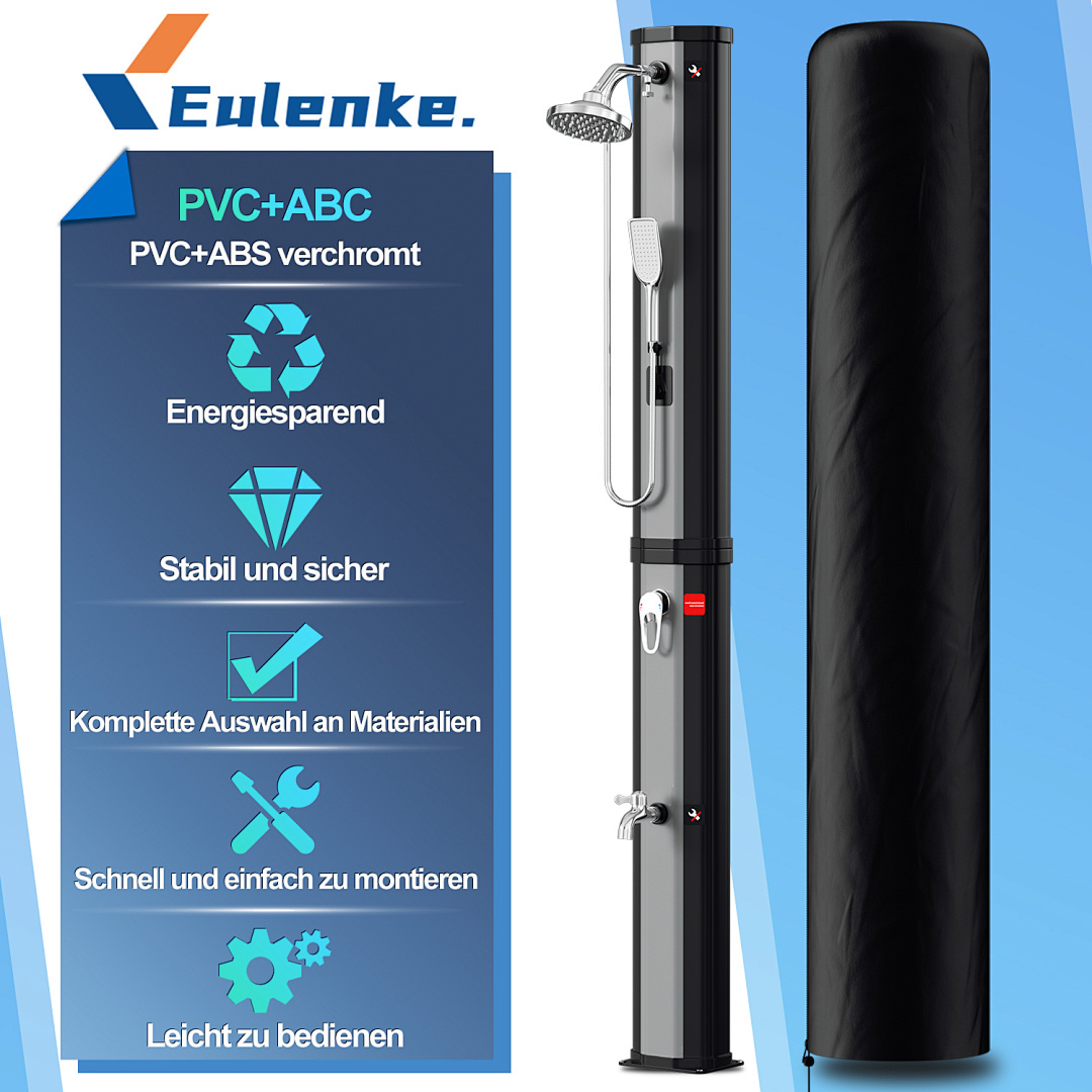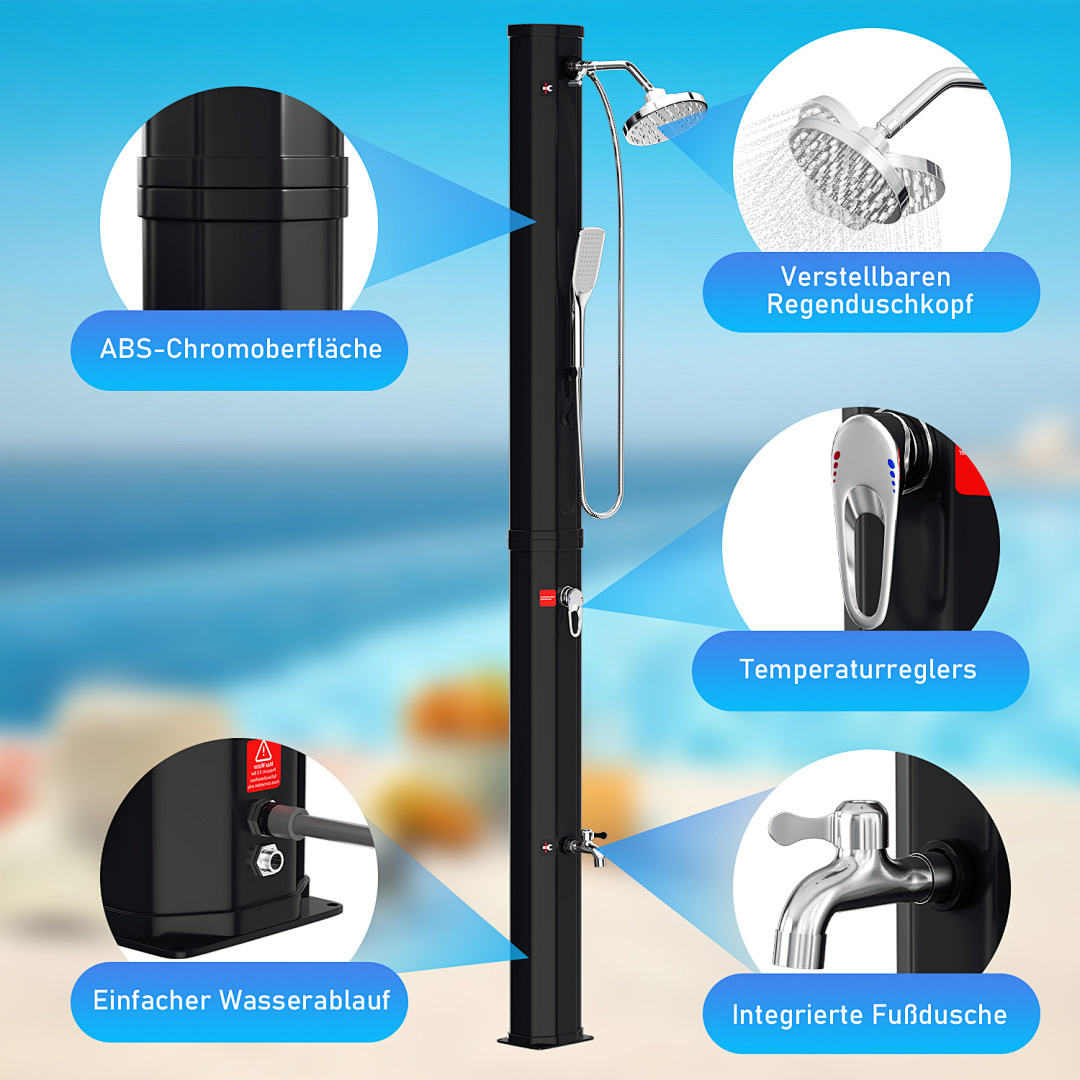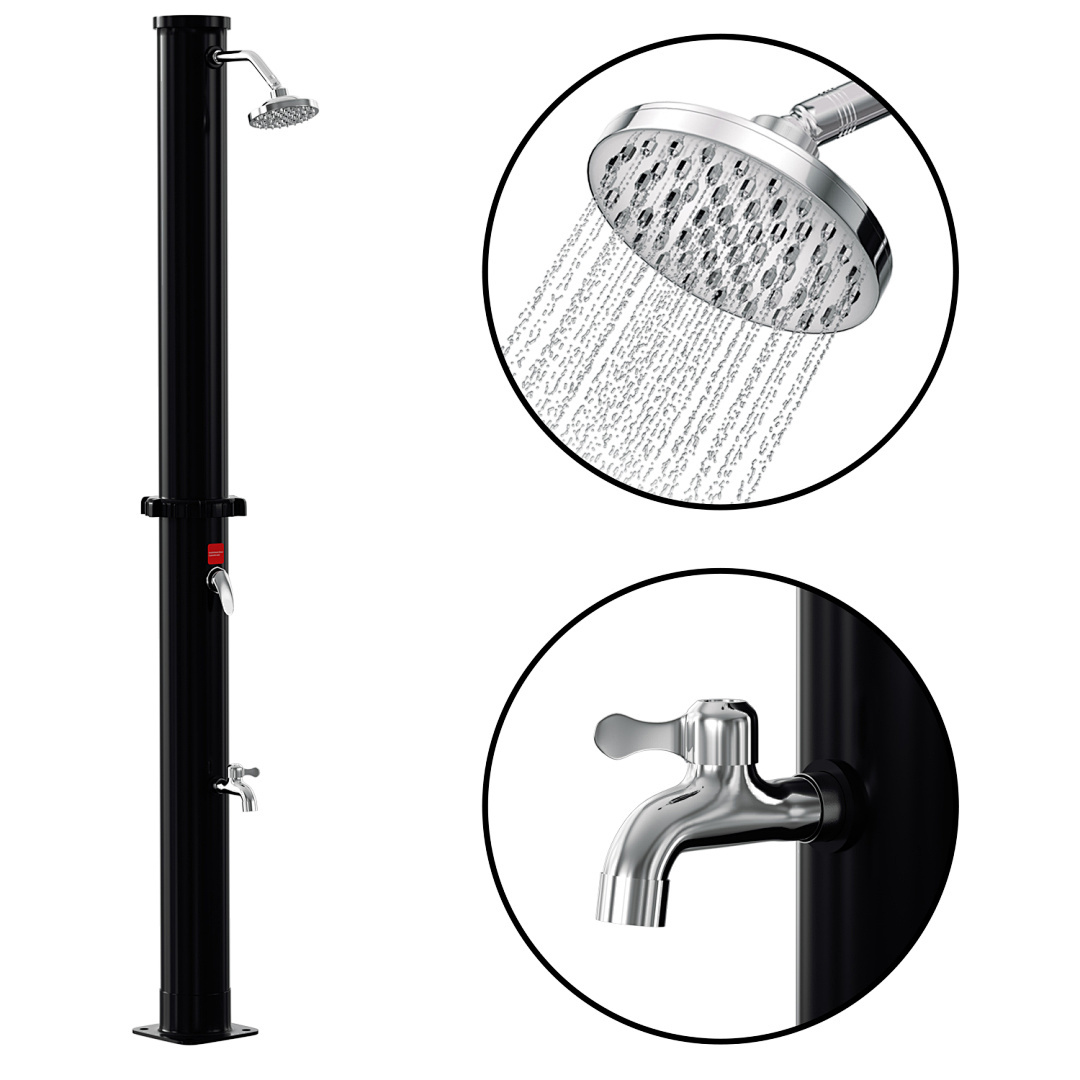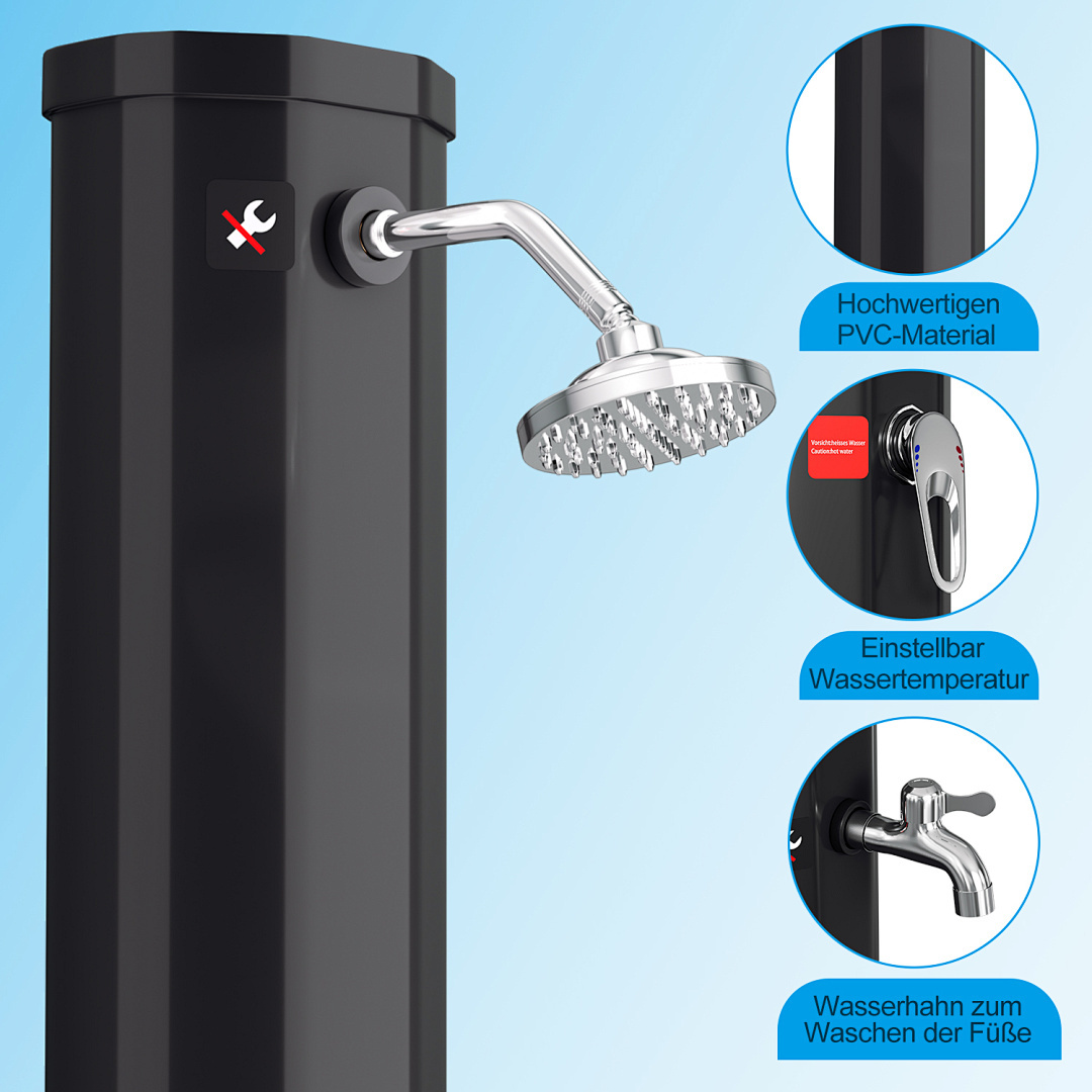 Diese Reihe von Solar-Gartenduschen bietet eine große Auswahl an Fassungsvermögen von 20 Litern bis 60 Litern, um verschiedenen Nutzern gerecht zu werden. Ob für den Einzelgebrauch in einem kleinen Garten oder für einen großen Garten, der von mehreren Personen genutzt wird, diese Duschen liefern reichlich warmes Wasser. Die aus hochwertigem Kunststoff und Chrom gefertigten Brausen bieten ein modernes und langlebiges Design und sind mit einem großen, um 360° verstellbaren Duschkopf ausgestattet, der ein komfortables Duscherlebnis garantiert. Dank des Standard-Gartenschlauchanschlusses und der einfachen Installation ist sie leicht zu bedienen. Die Erwärmung des Wassertanks durch Solarenergie ist sowohl umweltfreundlich als auch energieeffizient und macht sie zur idealen Lösung für das Duschen im Freien.