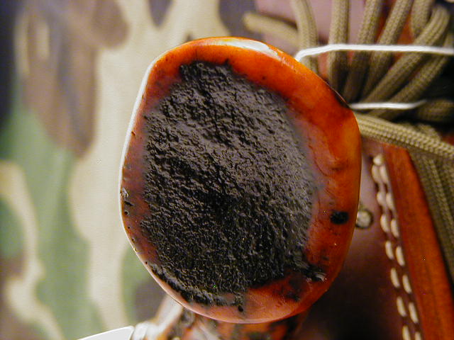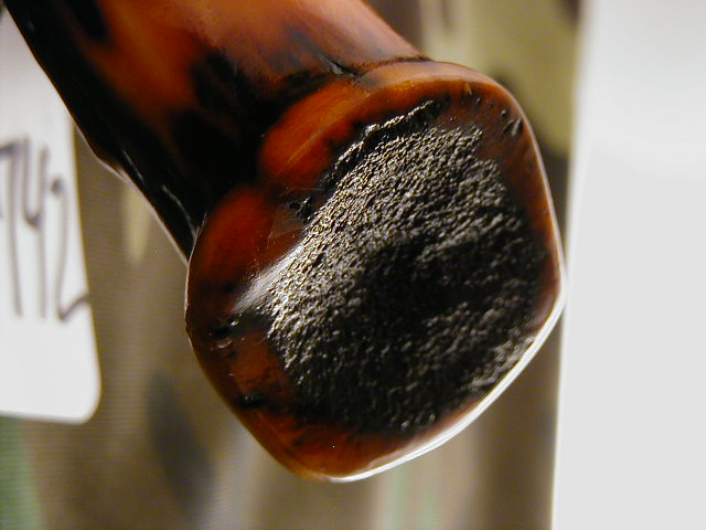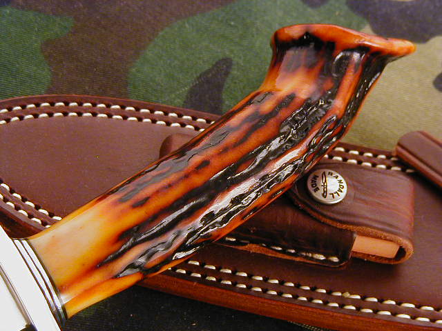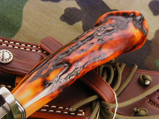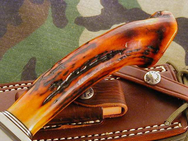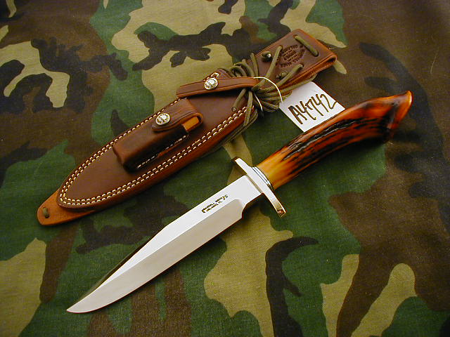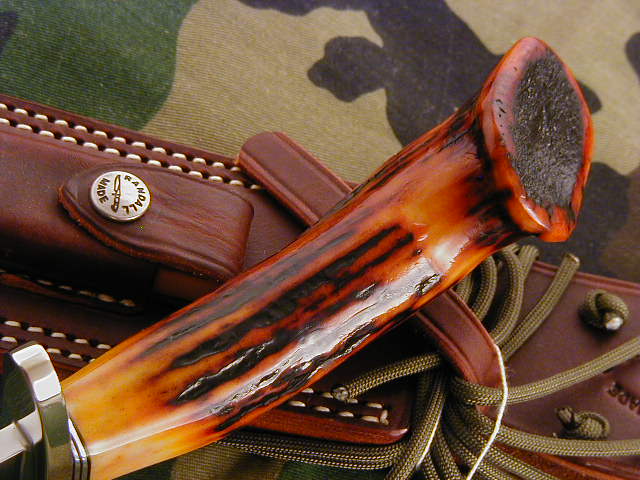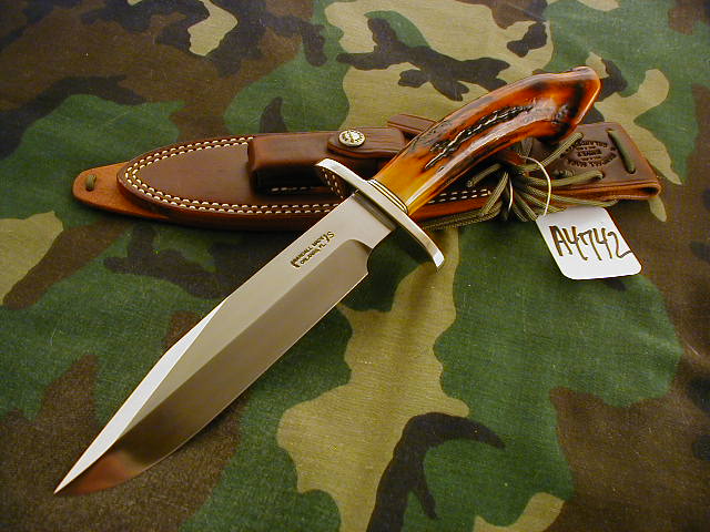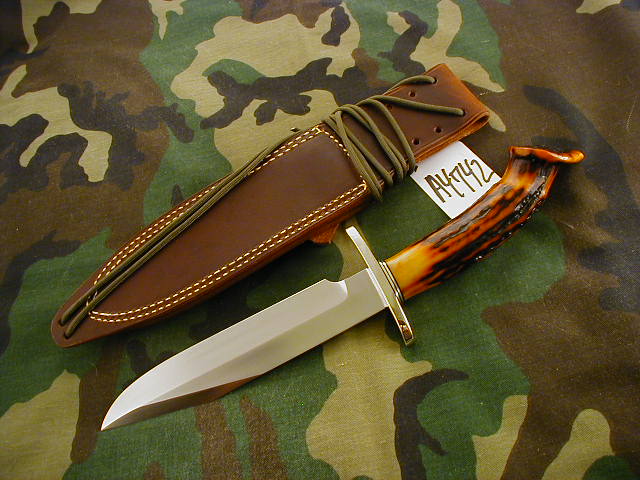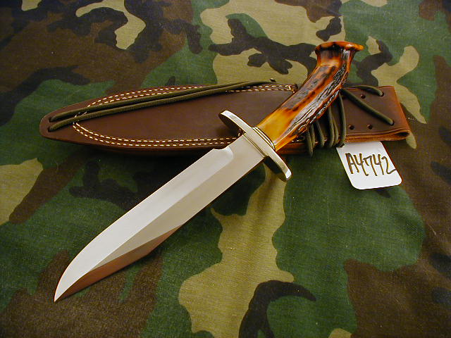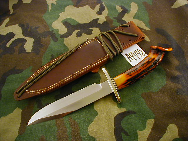 NEW RANDALL MODEL #14 CUT DOWN TANG WITH 7 1/2" STAINLESS STEEL BLADE, NICKEL SILVER DOUBLE FORWARD CURVED HILT, BLACK-ALUMINUM SPACERS, CUSTOM SUPPLIED DYED CROWN STAG HANDLE AND BROWN SHEATH.