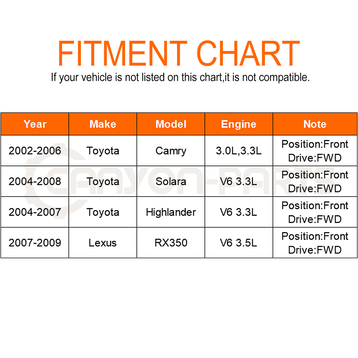 | 2002-2006 | Toyota | Camry | Front | V6 3.0L,3.3L |