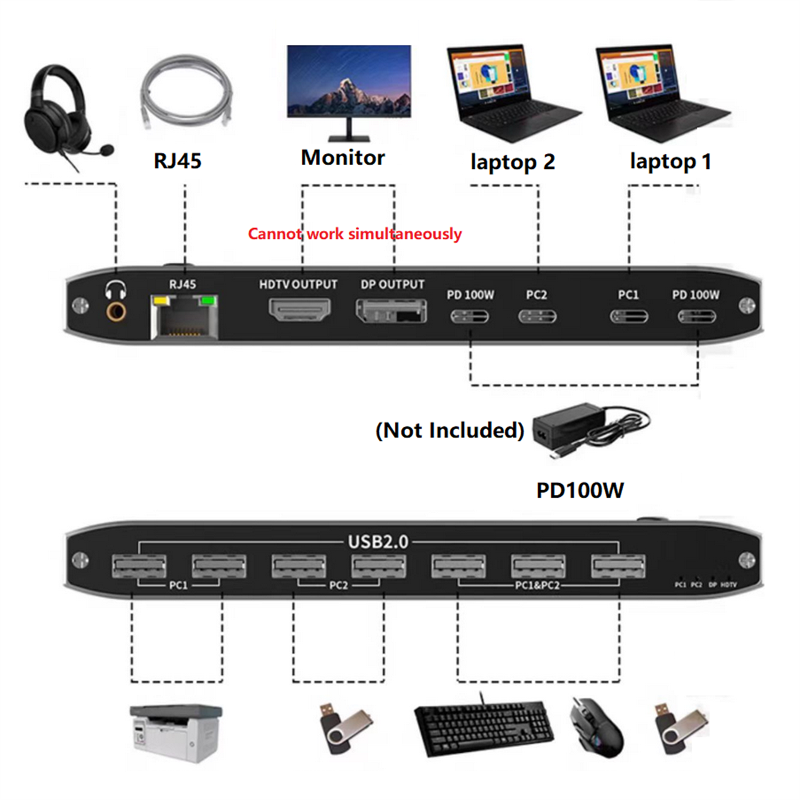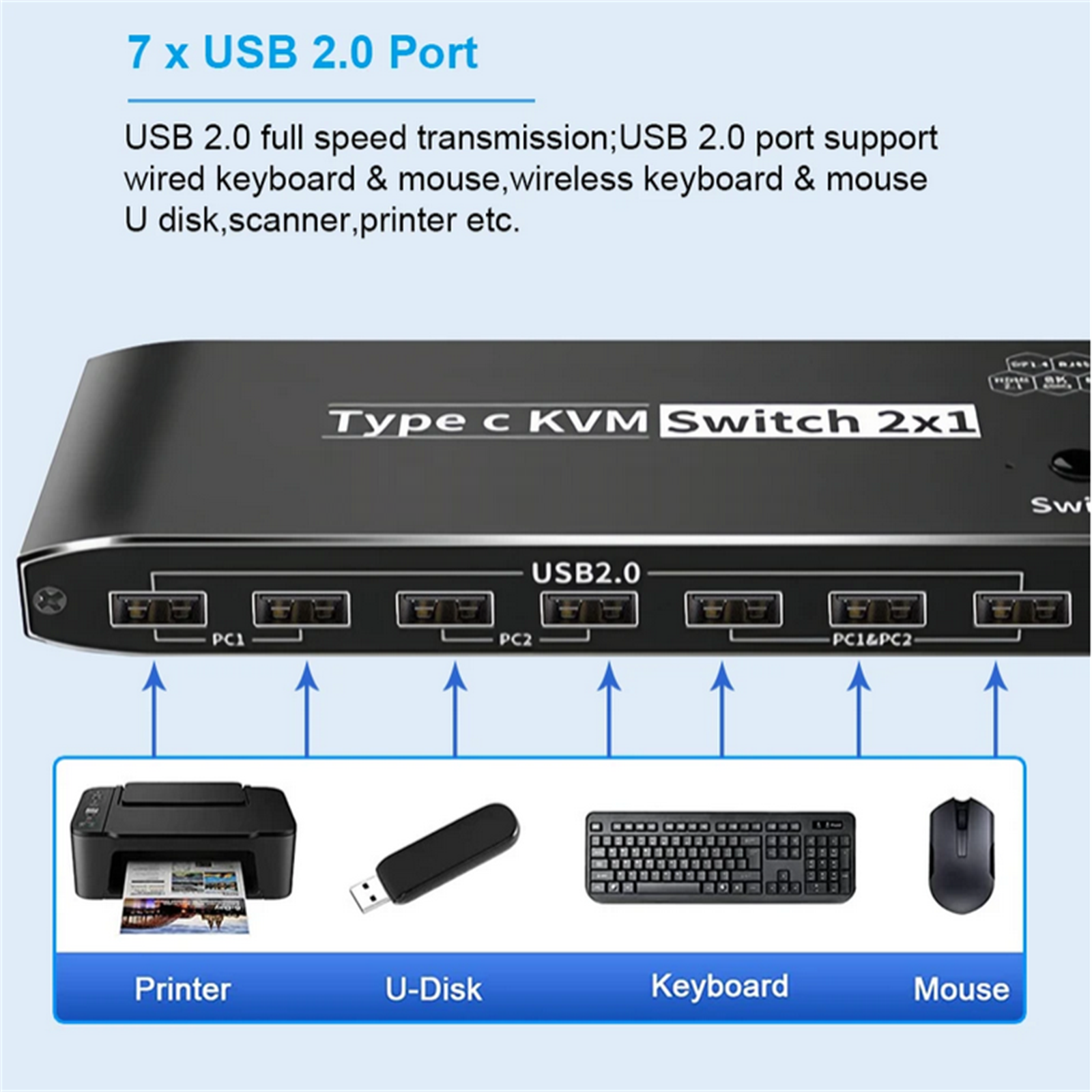 1.With 7 x USB 2.0 Output Port, two Computers share one set,you can connect 7 x USB2.0 Output to your USB Mouse, Keyboard, Printer, Disks, or other usb devices, while you switch from one PC to another PC, Your USB device will be synced to your external display without pluging and unpluging the related USB device repeatedly. The USB Port supports the USB 2.0 Specifications and the transfer rate is 480Mbps