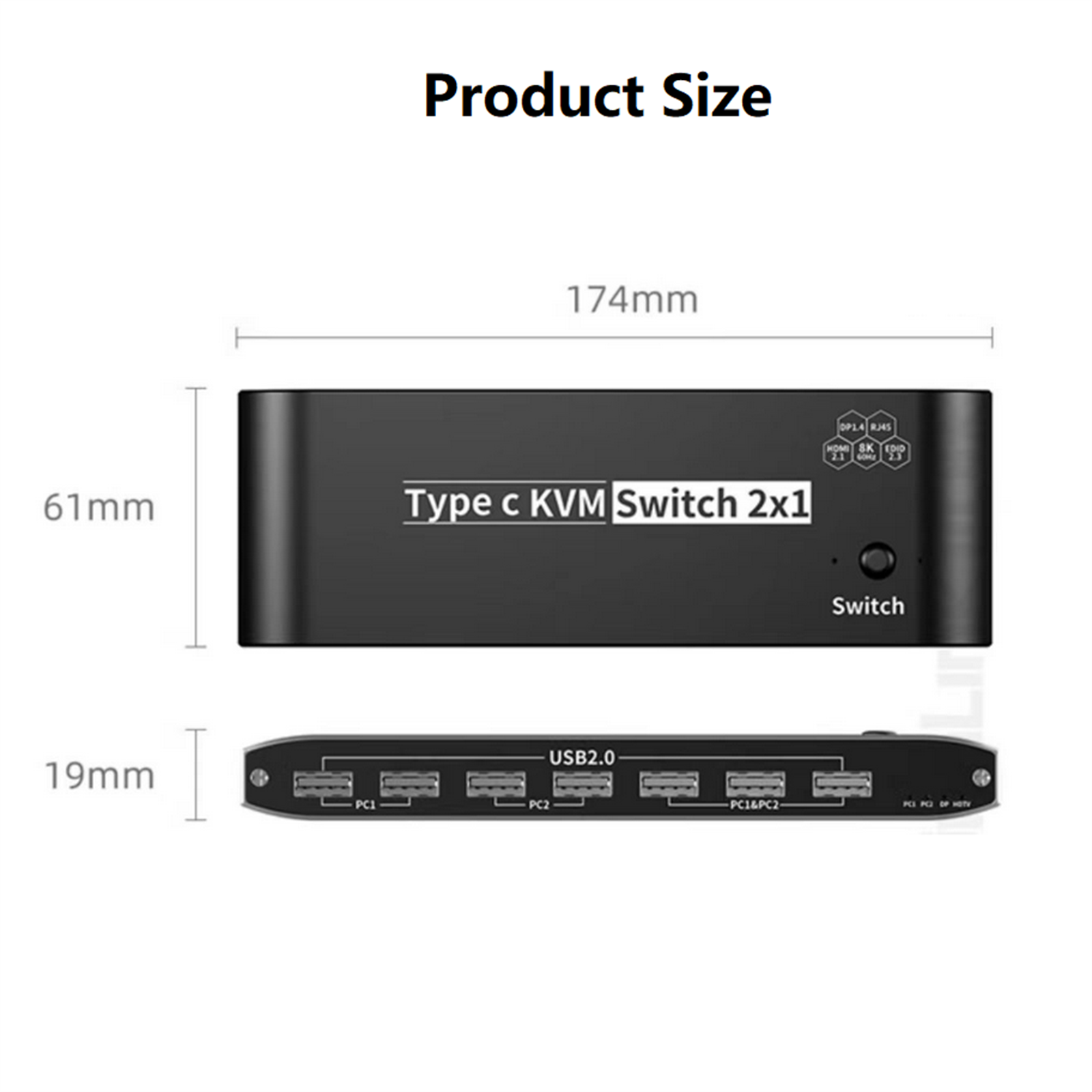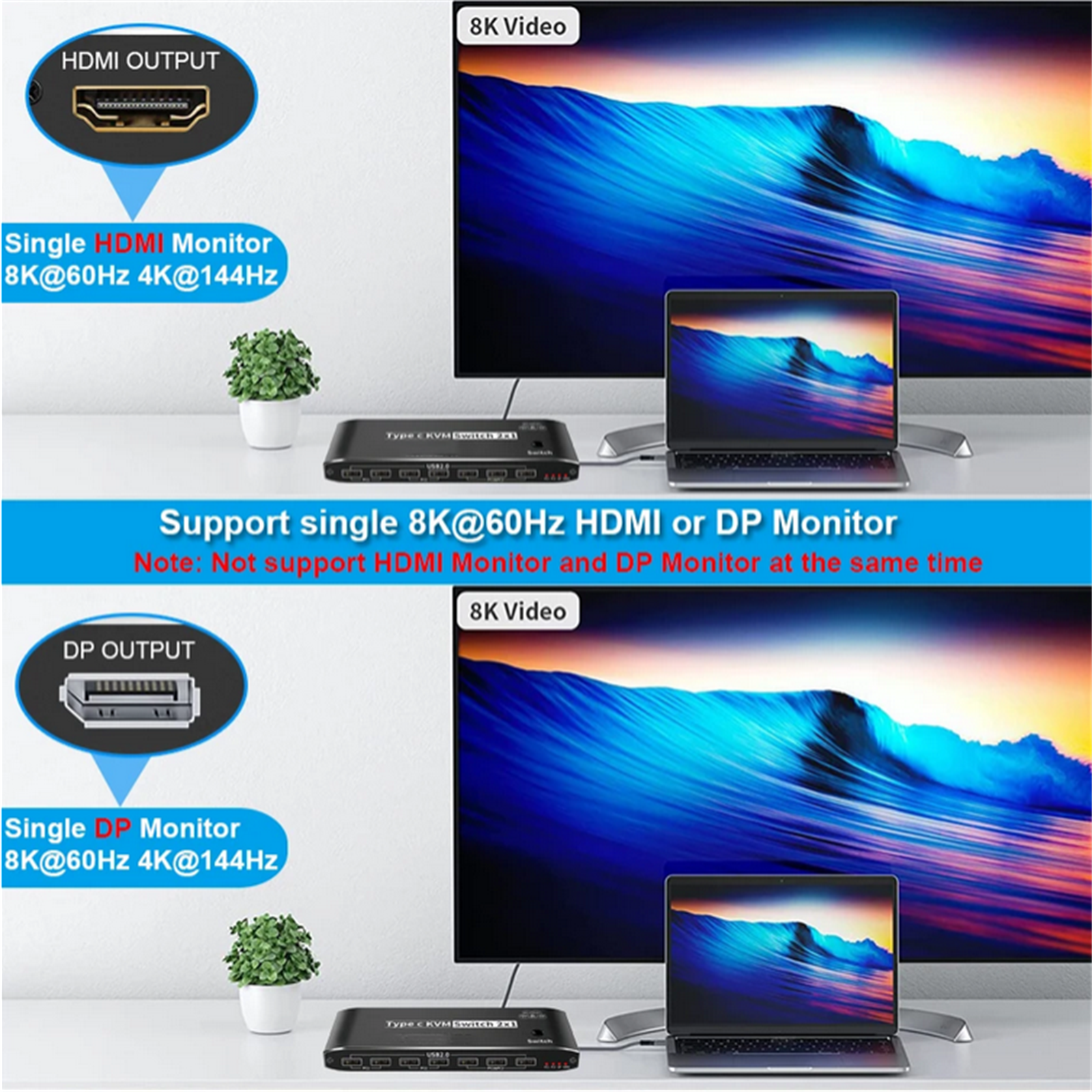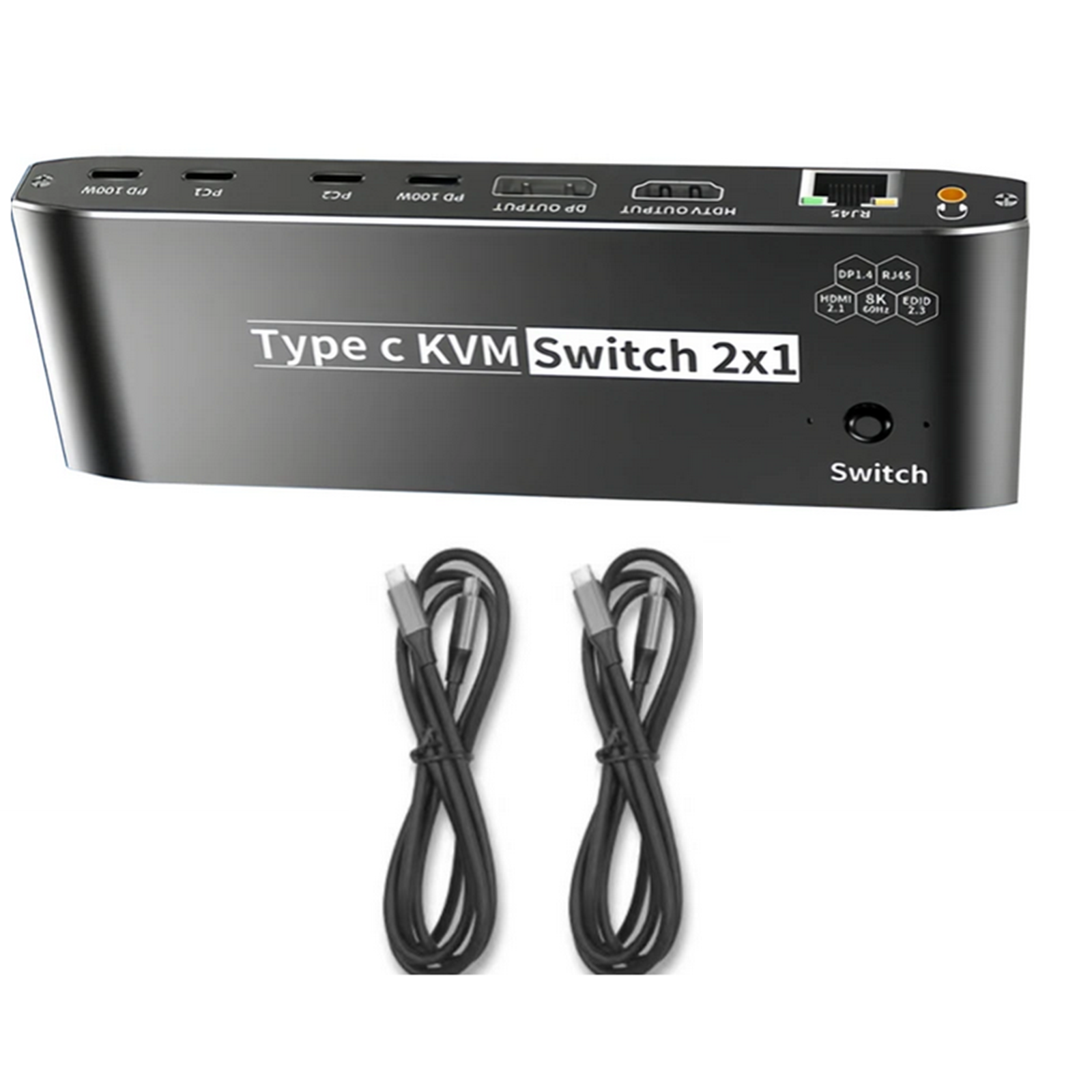 3. 2x USB-C 8K KVM Switch with one DisplayPort 1.4 or HDMI 2.1 Port for Video, with this 2 Port 8K KVM Switcher, you are able to connect from the switcher's two PC Input Port to your USB-C PC/Laptops via two standard USB-C Gen-2 Cable, then connect from the switcher's Standard DP 1.4 /HDMI 2.1 port to your Monitors via your own displayport 8K Standard Cable, you can press the "Switch"button to switch between two of your PC. (Note: You must plug our USB C to USB A cable to power the switcher while working)