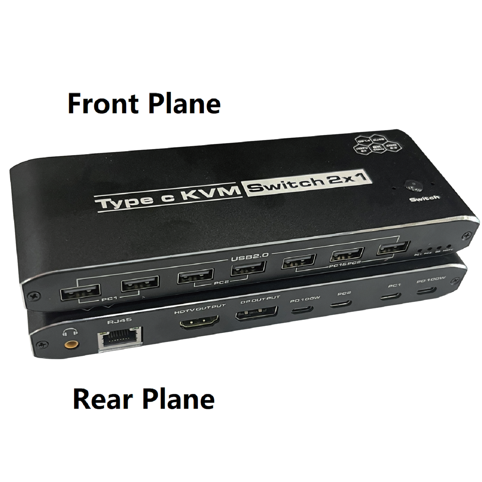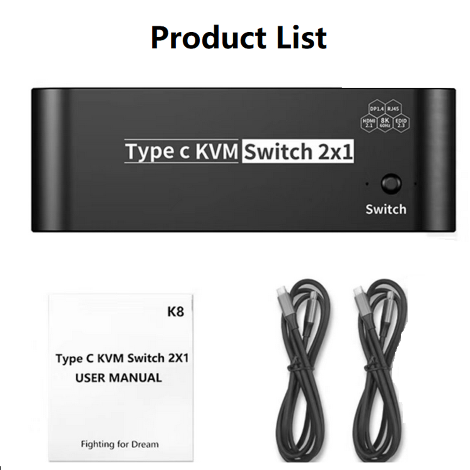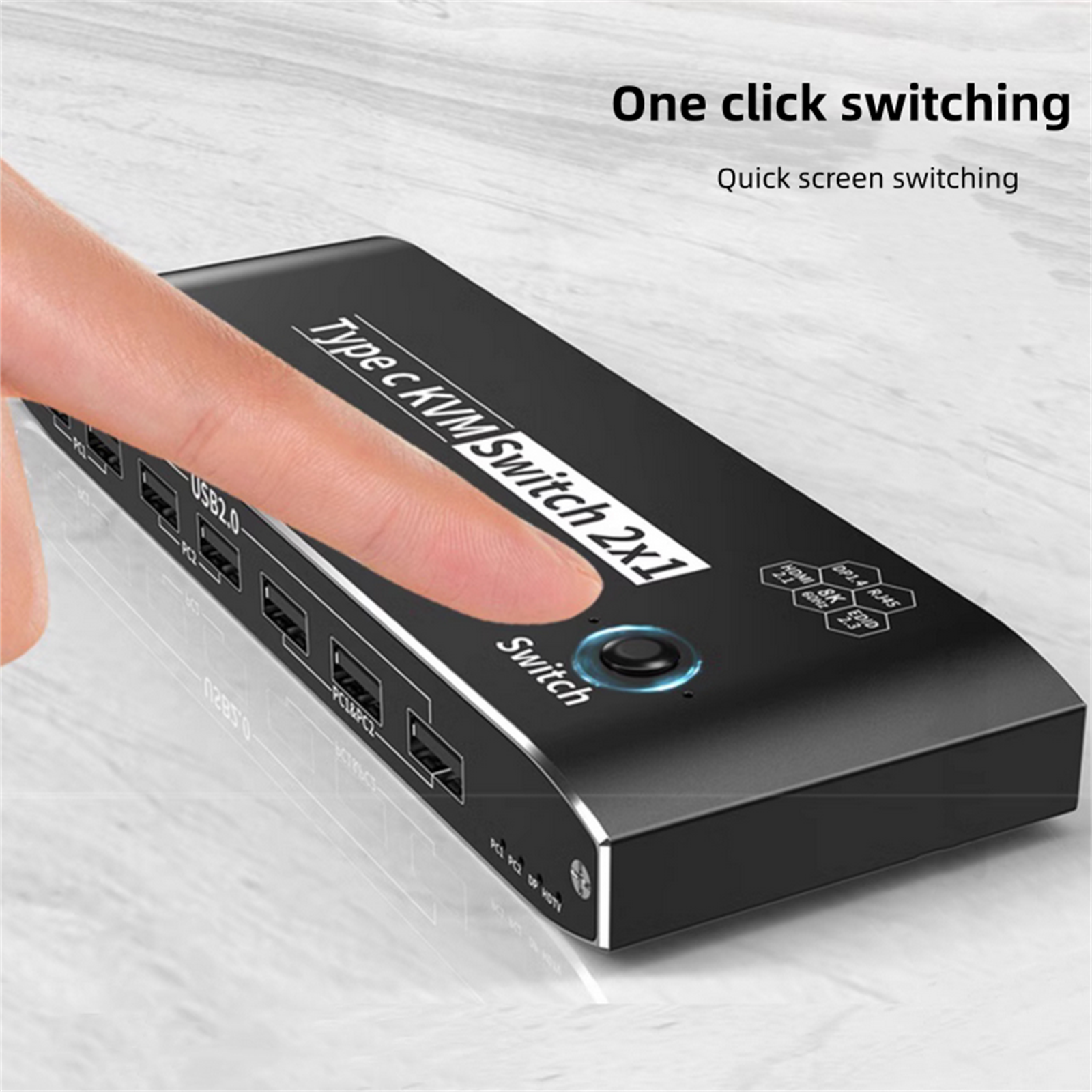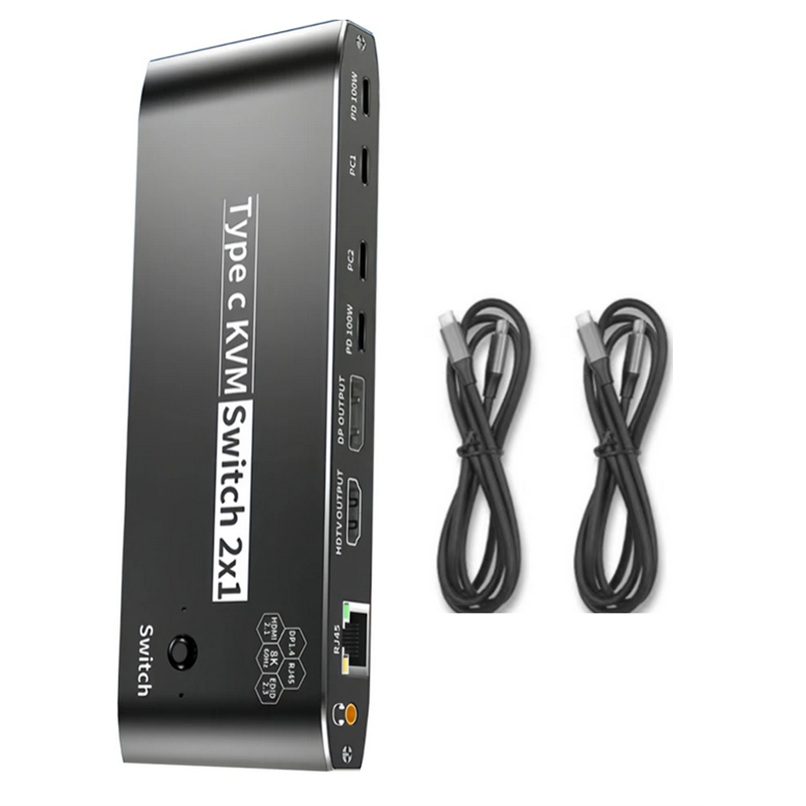 3. 2x USB-C 8K KVM Switch with one DisplayPort 1.4 or HDMI 2.1 Port for Video, with this 2 Port 8K KVM Switcher, you are able to connect from the switcher's two PC Input Port to your USB-C PC/Laptops via two standard USB-C Gen-2 Cable, then connect from the switcher's Standard DP 1.4 /HDMI 2.1 port to your Monitors via your own displayport 8K Standard Cable, you can press the "Switch"button to switch between two of your PC. (Note: You must plug our USB C to USB A cable to power the switcher while working)