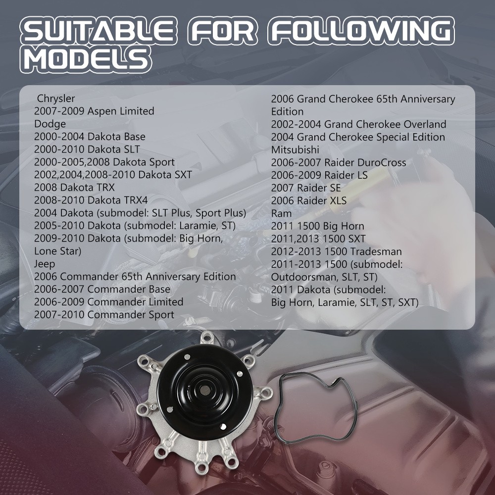 Fitment: For Chrysler 2007-2009 Aspen Limited For Dodge 2000-2004 Dakota Base 2000-2010 Dakota SLT 2000-2005,2008 Dakota Sport 2002,2004,2008-2010 Dakota SXT 2008 Dakota TRX 2008-2010 Dakota TRX4 2004 Dakota (submodel: SLT Plus, Sport Plus) 2005-2010 Dakota (submodel: Laramie, ST) 2009-2010 Dakota (submodel: Big Horn, Lone Star) 2006-2008 Durango Adventurer 2000-2001 Durango Base 2004-2009 Durango Limited 2009 Durango SE 2000-2009 Durango SLT 2000,2002-2003,2008 Durango SLT Plus 2000,2002-2003 Durango Sport 2004-2005 Durango ST 2003,2005-2008 Durango SXT 2011 Nitro Heat 2008-2011 Nitro SE 2007-2009 Nitro SLT 2007-2011 Nitro SXT 2003-2004,2006 Ram 1500 Laramie 2008 Ram 1500 SXT 2009-2010 Ram 1500 TRX 2006-2007,2009-2010 Ram 1500 TRX4 2002-2010 Ram 1500 (submodel: SLT, ST) For Jeep 2006 Commander 65th Anniversary Edition 2006-2007 Commander Base 2006-2009 Commander Limited 2007-2010 Commander Sport 2006 Grand Cherokee 65th Anniversary Edition 2002-2004 Grand Cherokee Overland 2004 Grand Cherokee Special Edition 2002 Grand Cherokee Sport 2010 Grand Cherokee (submodel: North Edition, S Limited) 99-2010 Grand Cherokee (submodel: Laredo, Limited) 2006 Liberty 65th Anniversary Edition 2008,2011-2012 Liberty North Edition 2003-2006,2010-2011 Liberty Renegade 2005 Liberty Rocky Mountain Edition 2002-2012 Liberty (submodel: Limited, Sport) 2012 Liberty (submodel: Jet, Limited Edition) For Mitsubishi 2006-2007 Raider DuroCross 2006-2009 Raider LS 2007 Raider SE 2006 Raider XLS For Ram 2011 1500 Big Horn 2011,2013 1500 SXT 2012-2013 1500 Tradesman 2011-2013 1500 (submodel: Outdoorsman, SLT, ST) 2011 Dakota (submodel: Big Horn, Laramie, SLT, ST, SXT Package Includes: 1x Engine Water Pump As the picture shown Note: "Here are 5 common symptoms of a bad water pump: Coolant Leak at the Front-Center of your Car Rust, Deposit Buildup, and Corrosion of the Water Pump Water Pump Pulley is Loose and Making Whining Sounds Engine is Overheating Steam Coming from your Radiator"