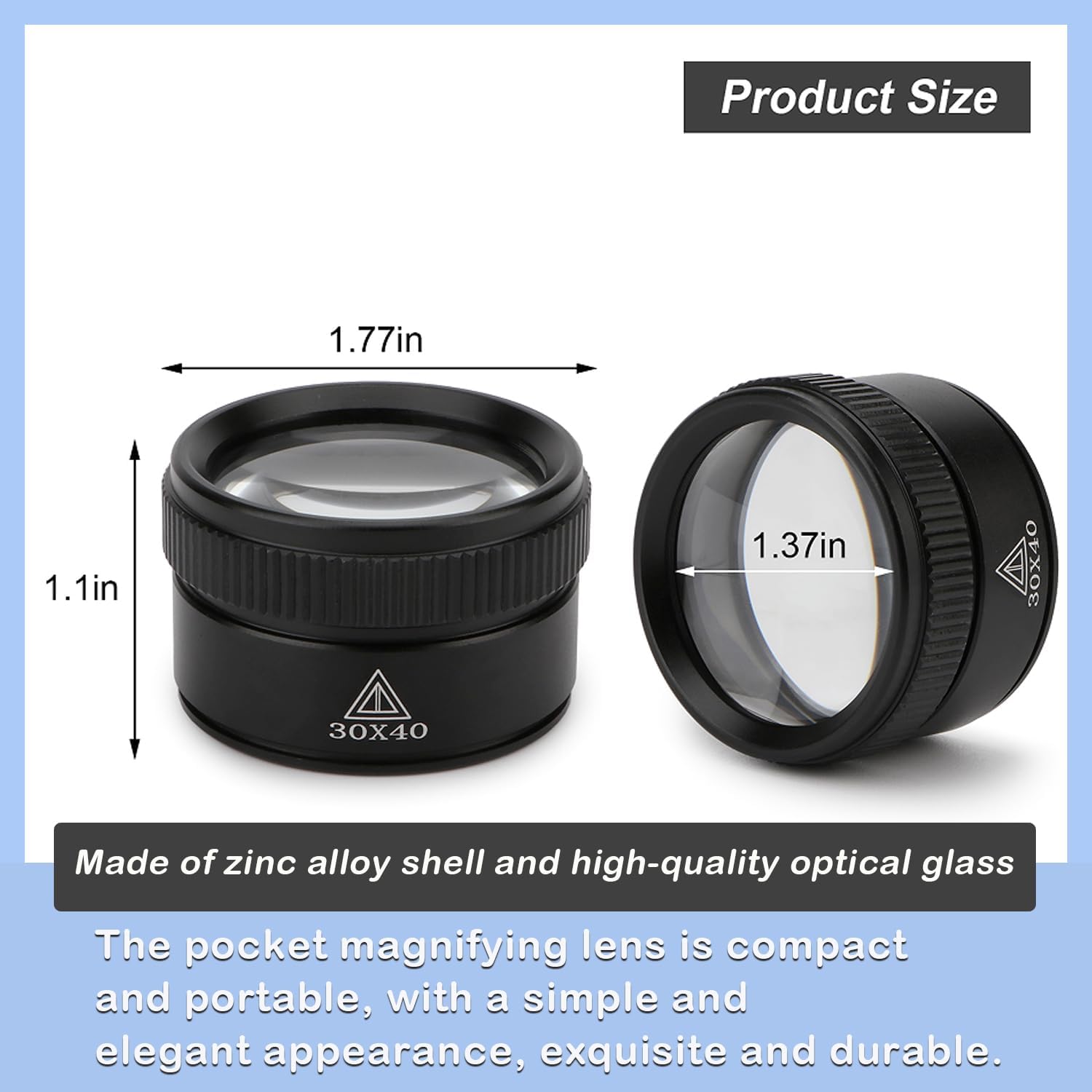 Portable: Pocket Size on Your Hand. 30 Times Magnification. the Diameter of Lens: 36mm, the Height of Magnifier: 1.18inch.