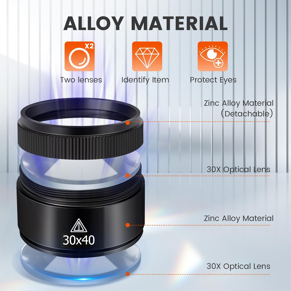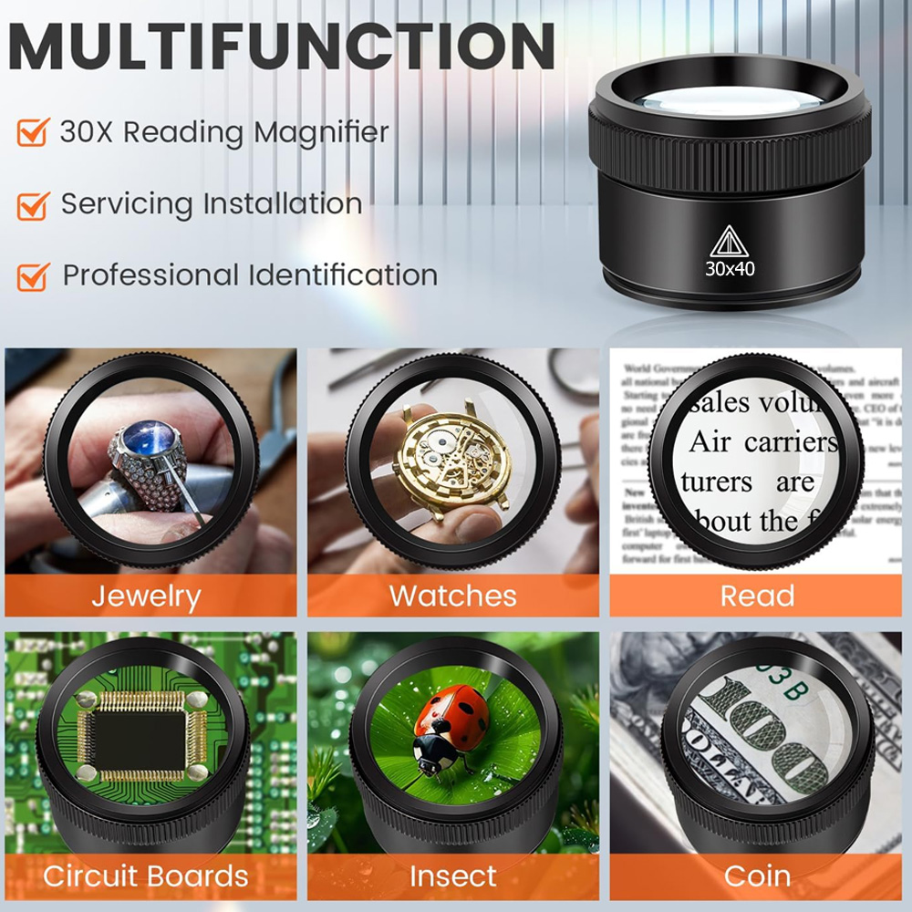 30X Magnification: 30X high magnification function,our magnifying glass can provide a clear, detailed view of small objects, whether it is to observe the fine texture of jewelry, identify coins and stamps, or to view the details of precision parts, can provide ultra-sharp, high-definition imaging effects
