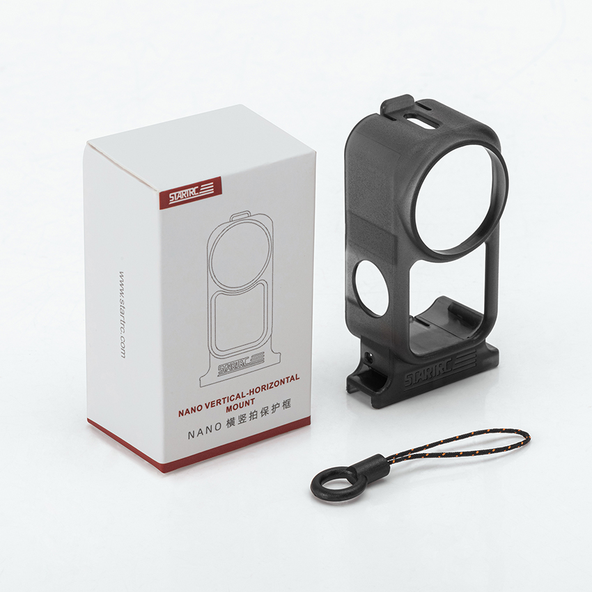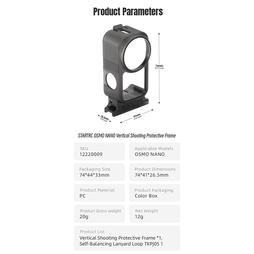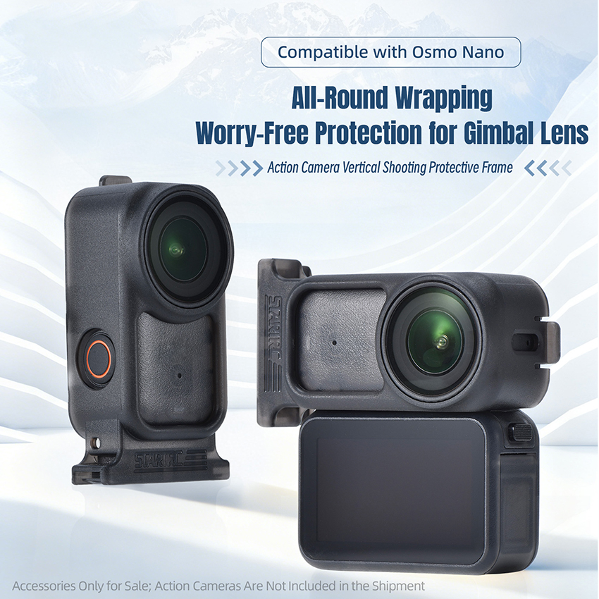 l Vertical Shooting Protective Frame Designed Exclusively for DJI OSMO NANO. Fully encloses the NANO main camera, effectively protecting the gimbal lens. Mounts without obstructing the frame. Features an expansion function at the bottom
