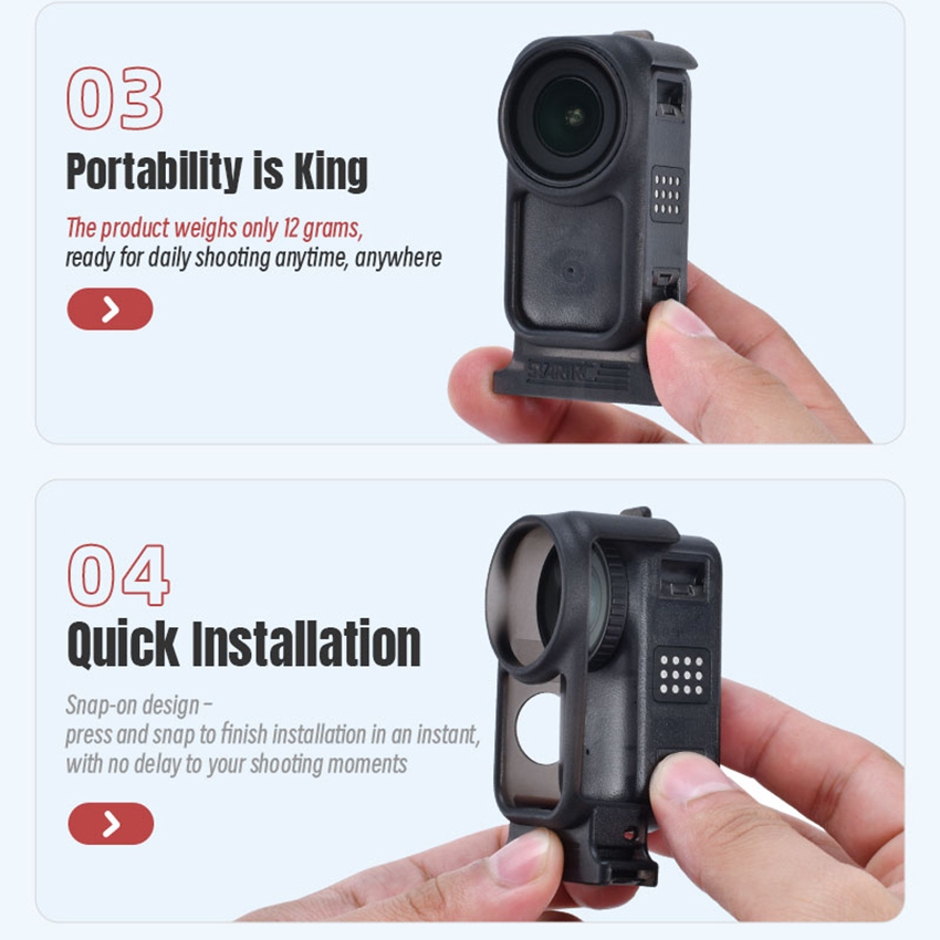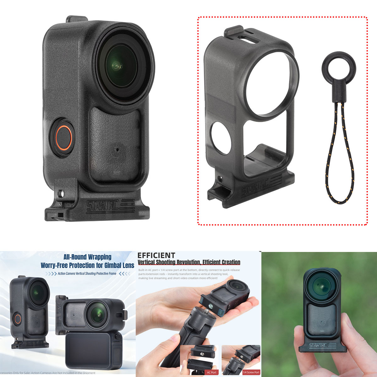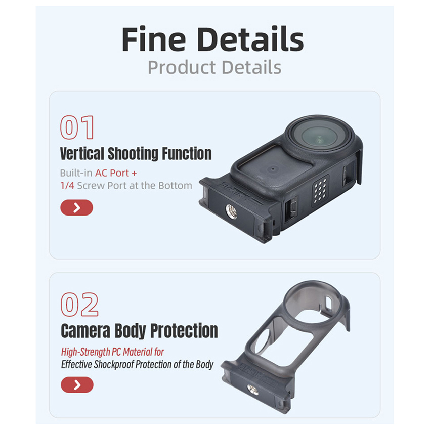 l Native vertical shooting with seamless switching—no cumbersome accessory adapters required. Serves as both a single-camera protective frame and an expansion frame. Bottom features an AC port and 1/4-inch screw hole. Pair with quick-release accessories or extension poles to support vertical shooting needs like adapter caps, magnetic bases, and more
