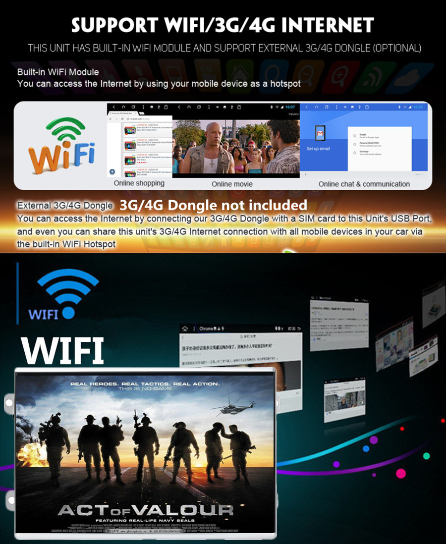 Meanwile the unit also canprovide WIFI connection for all devices inside the vehicle, even your mobile phone and tablet.