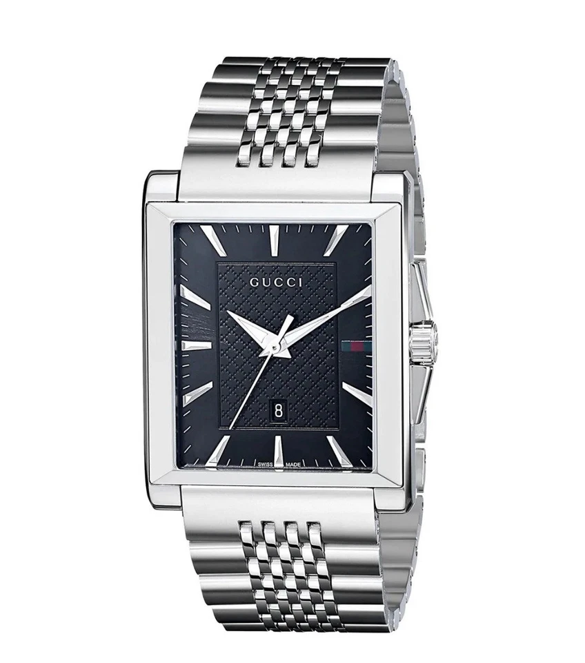 The Gucci G-Timeless Men's Black Dial Stainless Steel Watch - YA138401 is a sleek and stylish timepiece that effortlessly combines sophistication with durability. The watch features a robust stainless steel case and bracelet, offering a modern, polished look. The fixed stainless steel bezel adds to the overall clean and streamlined design, while the rectangular case shape and 9mm case thickness create a distinctive, bold presence on the wrist.