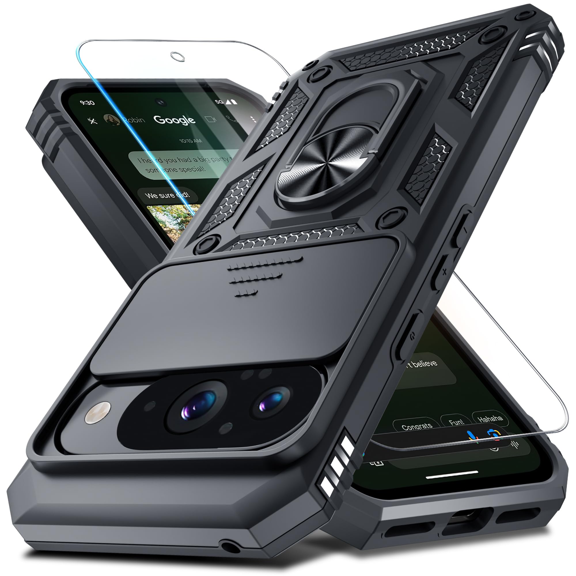 Case Compatible with Google Pixel 10/10 Pro Built in Slide Camera Lens Cover+Screen Protector+Finger Ring Holder Kickstand,Heavy Duty Shockproof Full Body Protective Phone Cover,Black