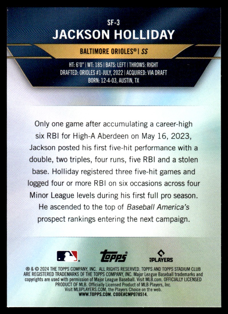| 2024 Stadium Club Special Forces Jackson Holliday Rookie Baltimore Orioles #SF-3 |