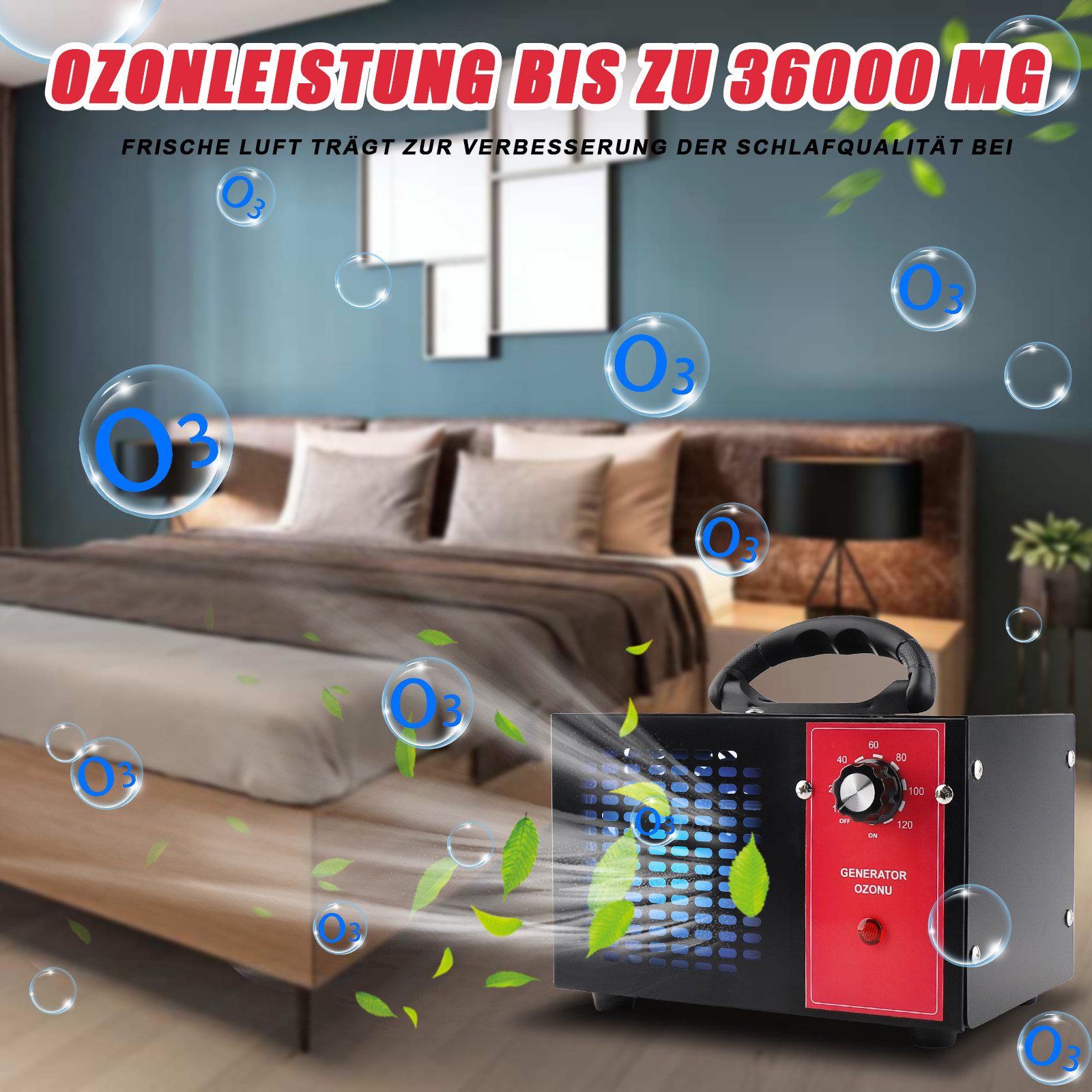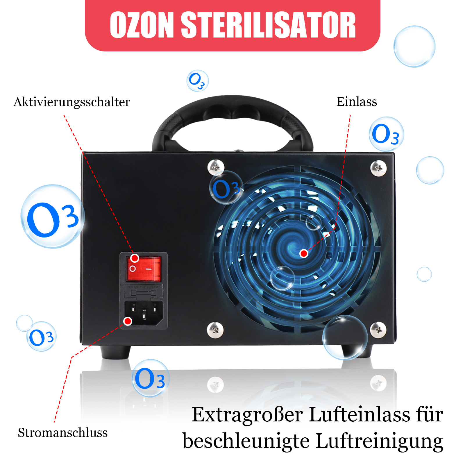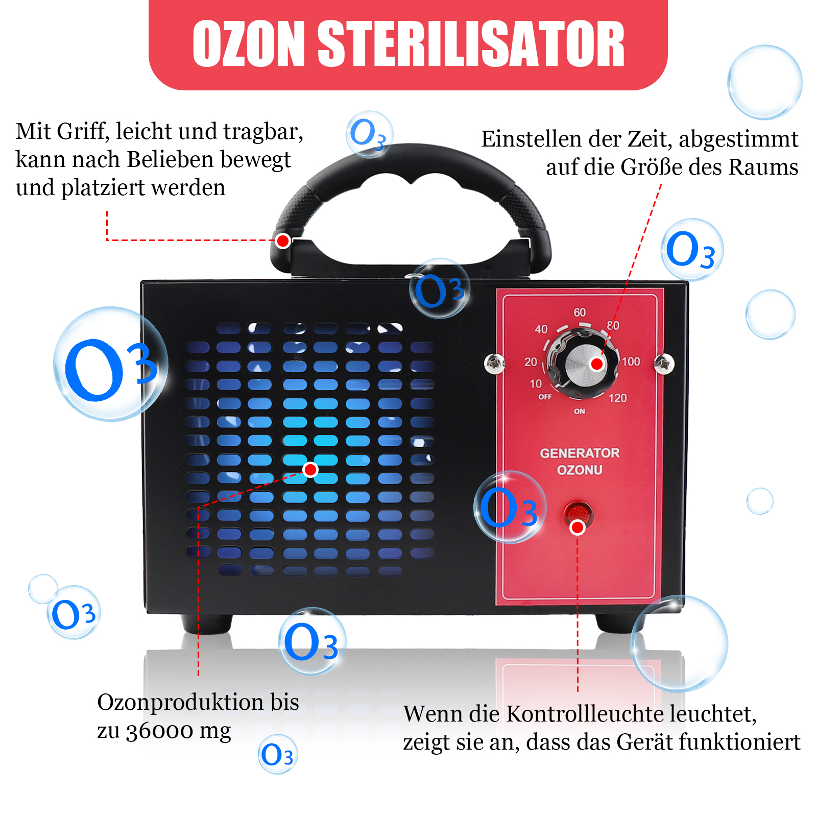 With its powerful blowers, the ozone generator quickly distributes ozone throughout the room, reacts with pollutants and quickly converts them into fresh oxygen. You and your family get a home full of natural atmosphere.
