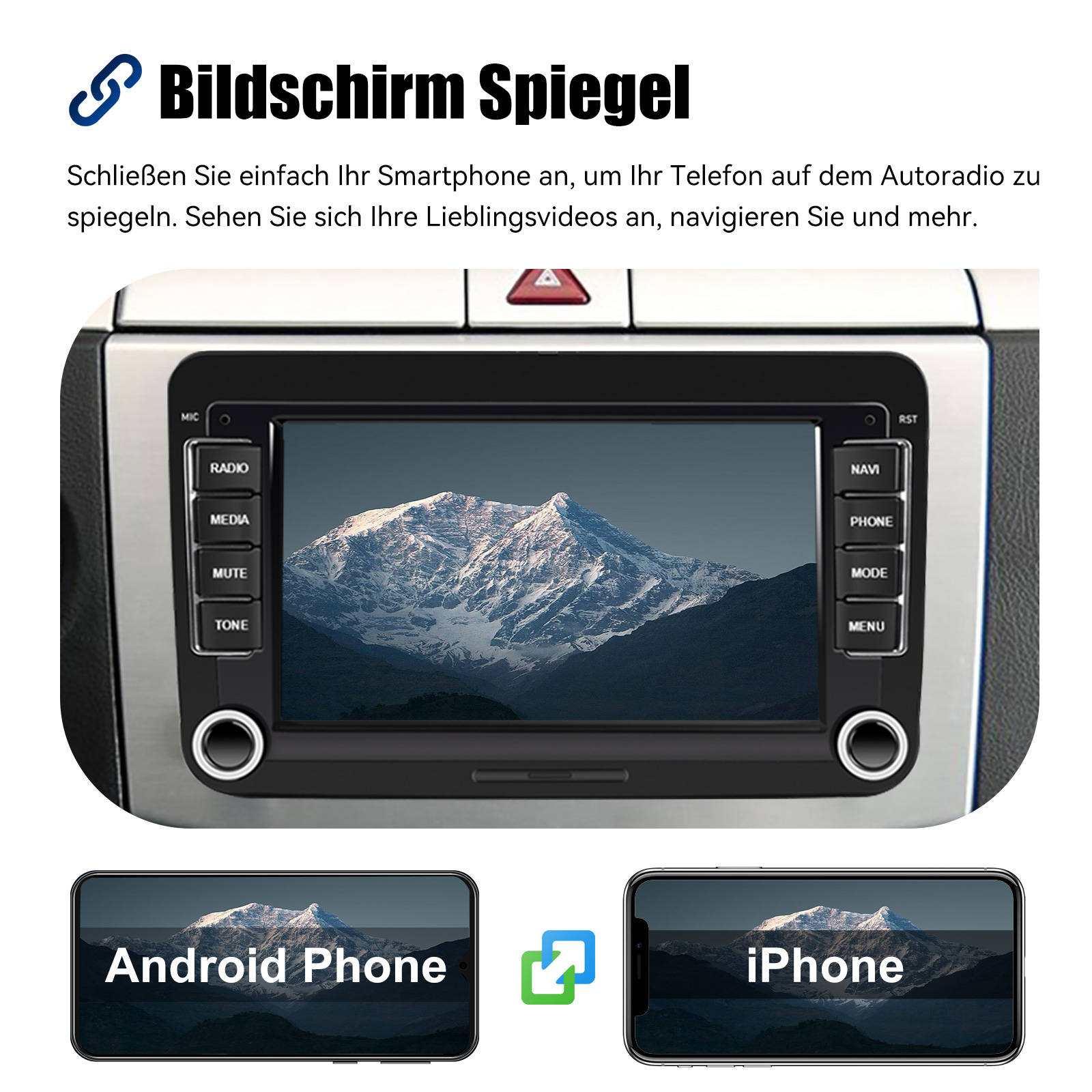 Bildschirm Spiegel für iOS/Android: Das Autoradio unterstützt Mirror Link für iOS/Android. Nachdem Sie das Radio angeschlossen haben, können Sie die Telefonseite mit dem 7-Zoll-Touchscreen des Radios synchronisieren. Das iPhone stellt eine Verbindung über WLAN her, und das Android-Telefon stellt eine Verbindung über WLAN oder das Original-USB-Kabel her (gilt nicht für Samsung- und Huawei-Telefone).