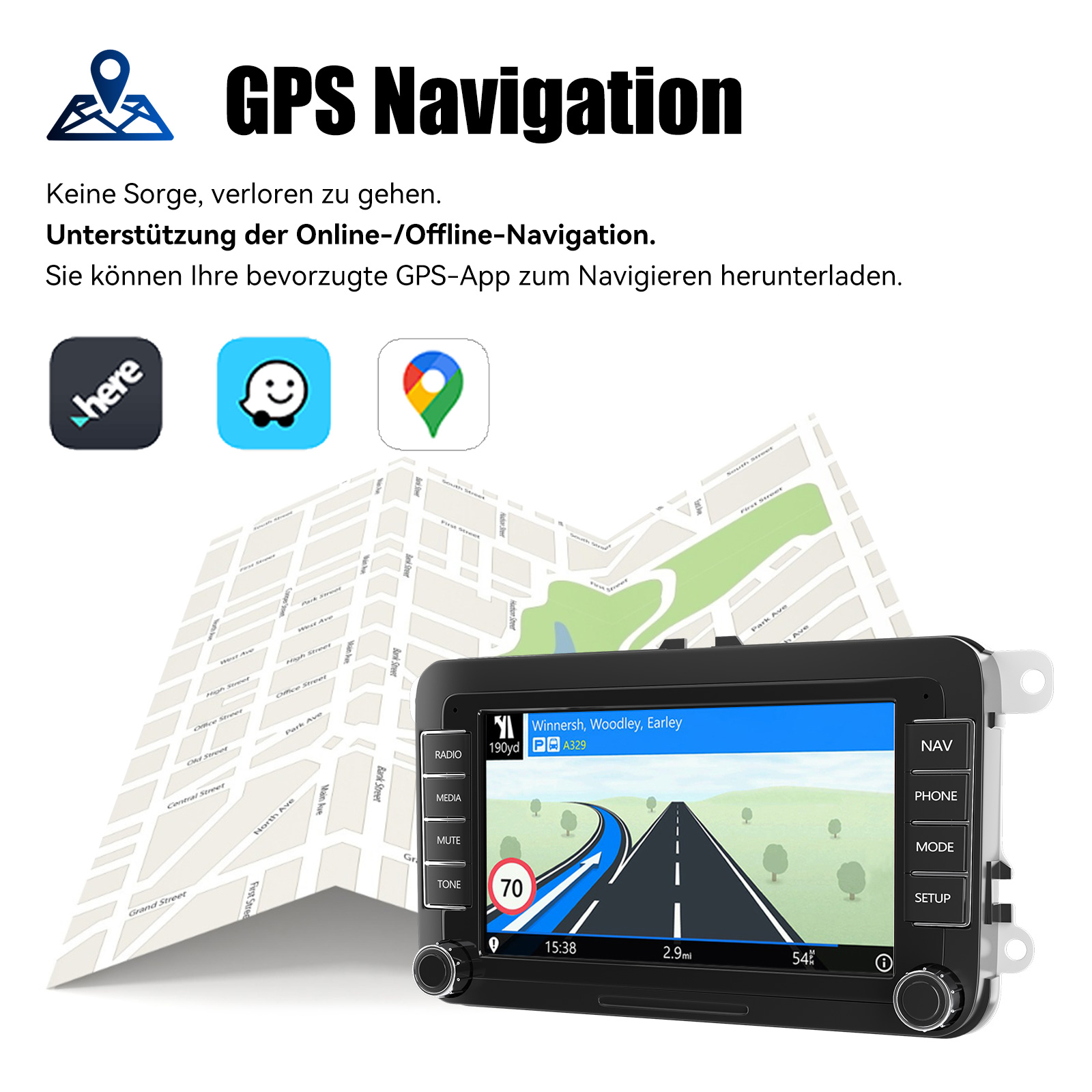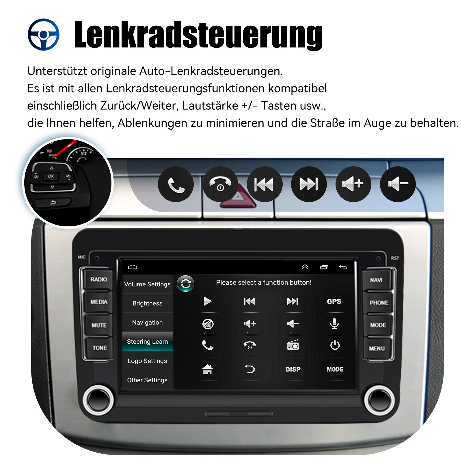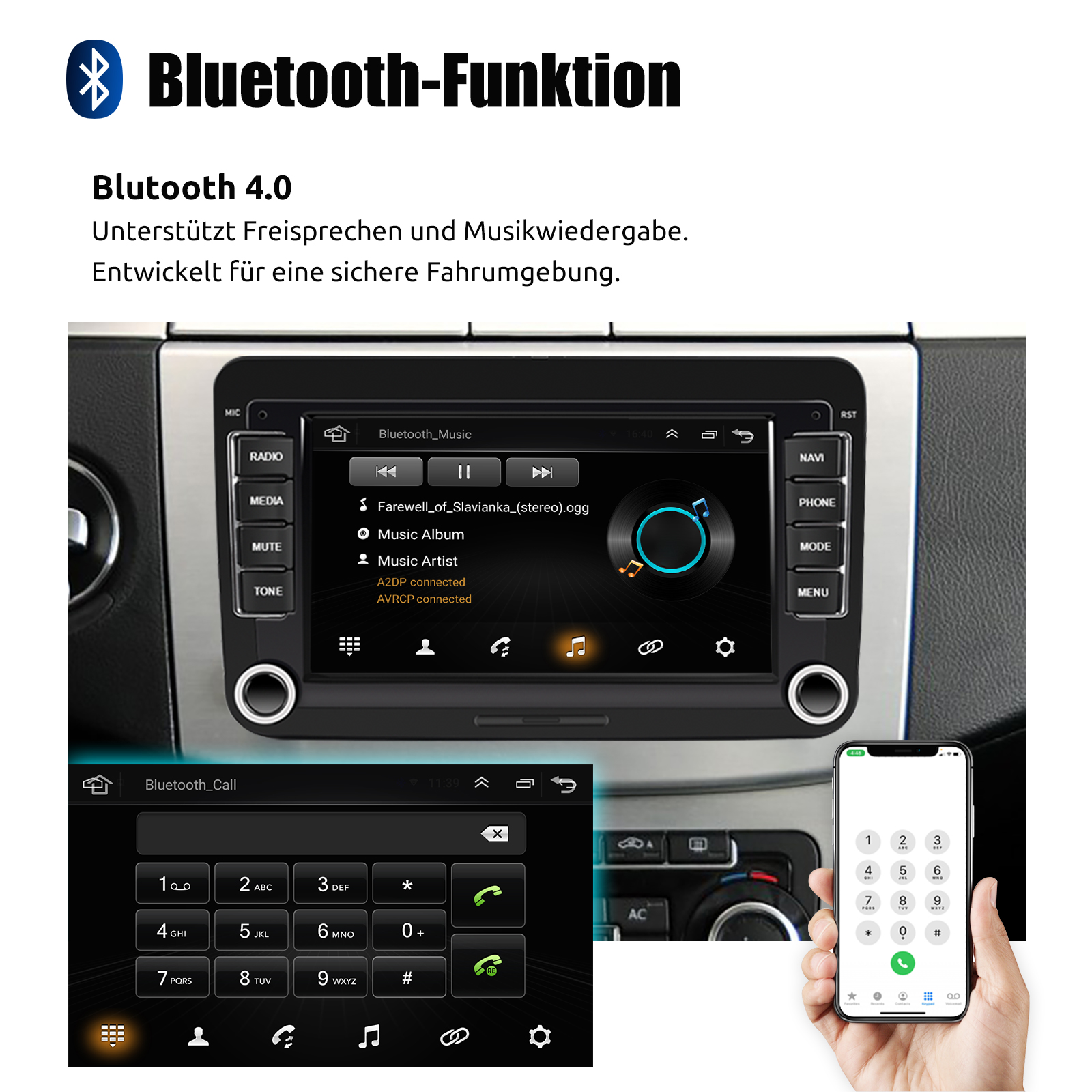 RDS/FM-Radio und Bluetooth: Integriertes Bluetooth 4.0 mit A2DP, unterstützt Bluetooth-Freisprecheinrichtung, Download von Telefonbuch-Anrufprotokollen, Audio-Streaming von Musik. Eingebautes Mikrofon, um Ihren Anruf klarer zu machen. UKW/RDS-Radio kann 30 gängige Sender mit hoher Stereoqualität voreinstellen, die vollautomatisch, halbautomatisch und präzise nach Kanälen suchen können.