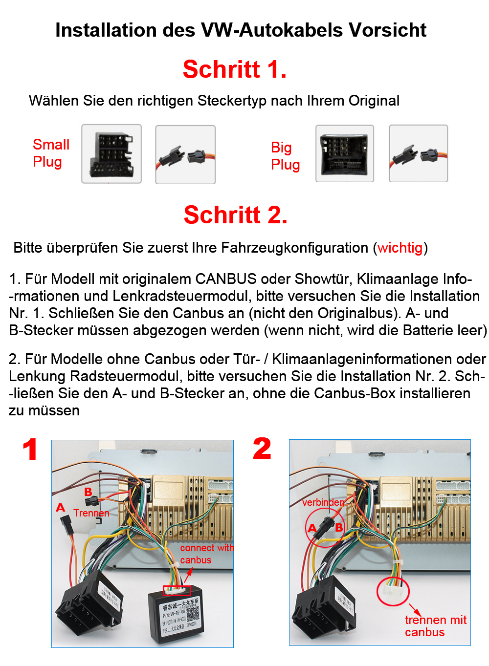 CANBUS ENTHALTEN - CANBUS dieses WIFI-Autoradios mit Navi kann helfen, Echtzeit-Informationssynchronisierung zu realisieren, Parksensoren, Rückfahrsignal, Klimaanzeige, Fahrzeuginformationen usw. zu unterstützen, wodurch die Fahrzeugsteuerung intelligenter und genauer wird. Hinweis: Nicht alle VW-Fahrzeuge müssen Canbus verwenden. 36-poliges Kabel für den kleinen Stecker und 40-poliges Kabel für den großen Stecker, um A und B zu verbinden.